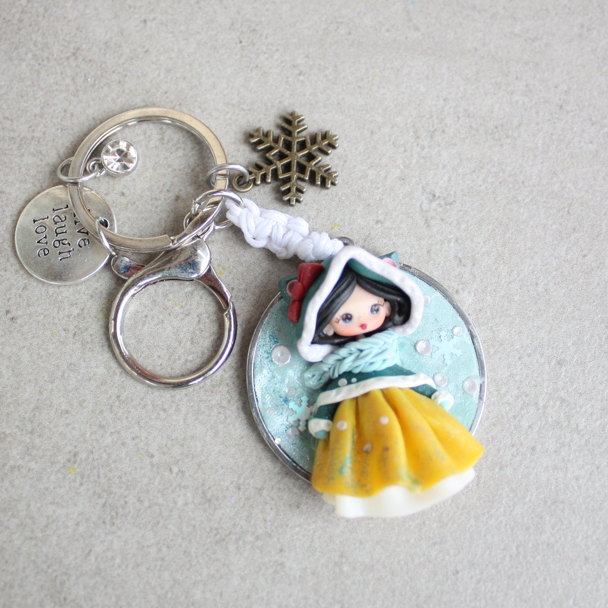 Handmade bag charm with a small kawaii doll sculpted by hand from polymer clay, without molds.