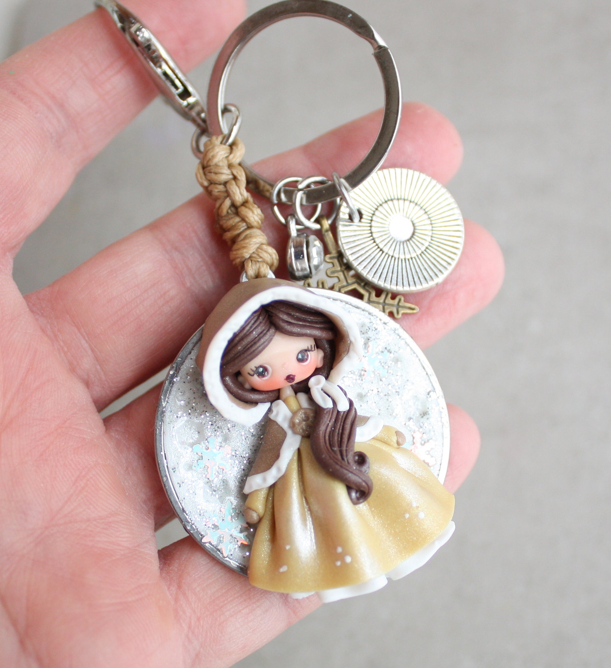 Handmade bag charm with a small kawaii doll sculpted by hand from polymer clay, without molds.