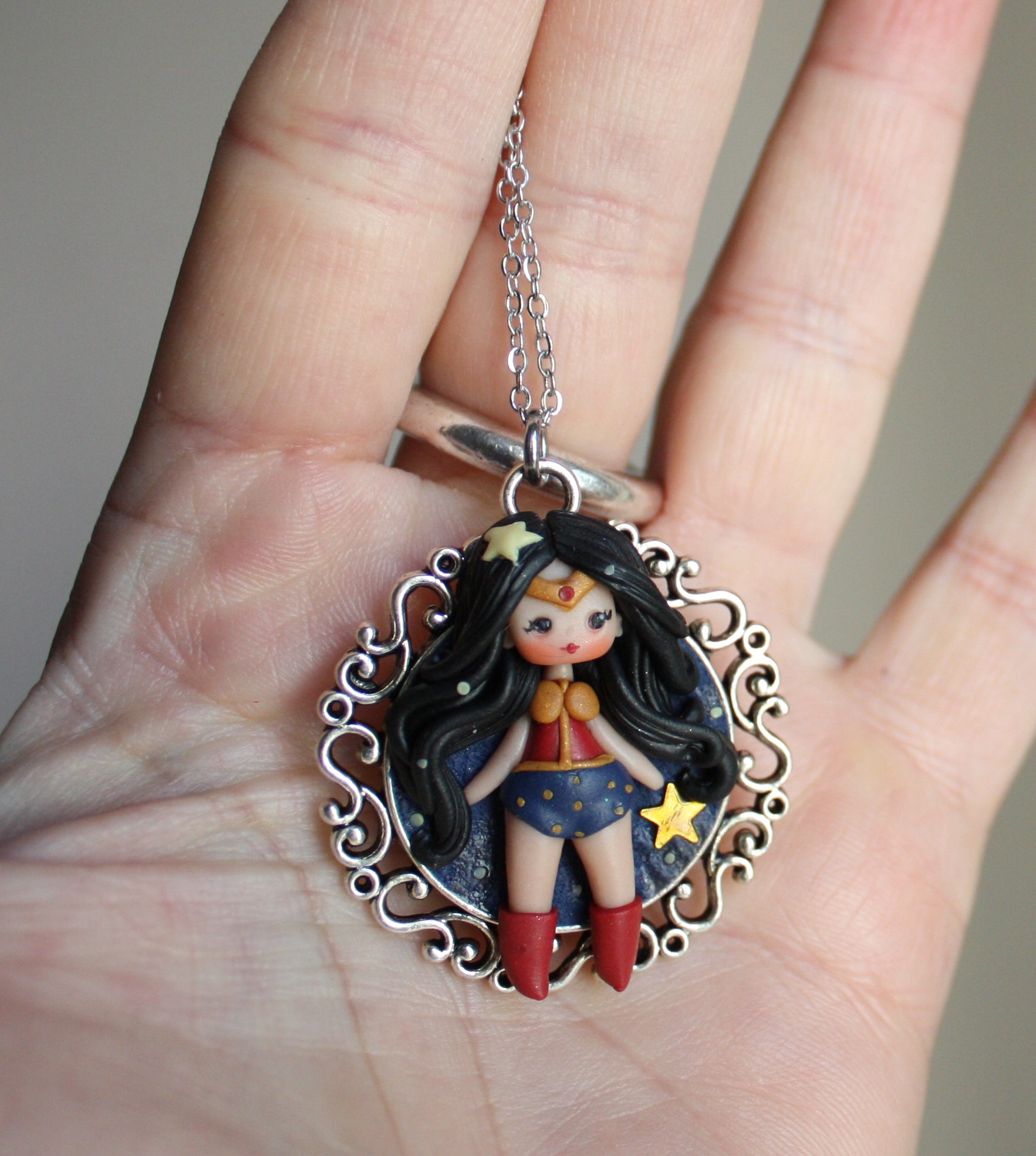 Stainless steel necklace featuring a tiny Wonder Woman hand-sculpted in polymer clay (fimo).