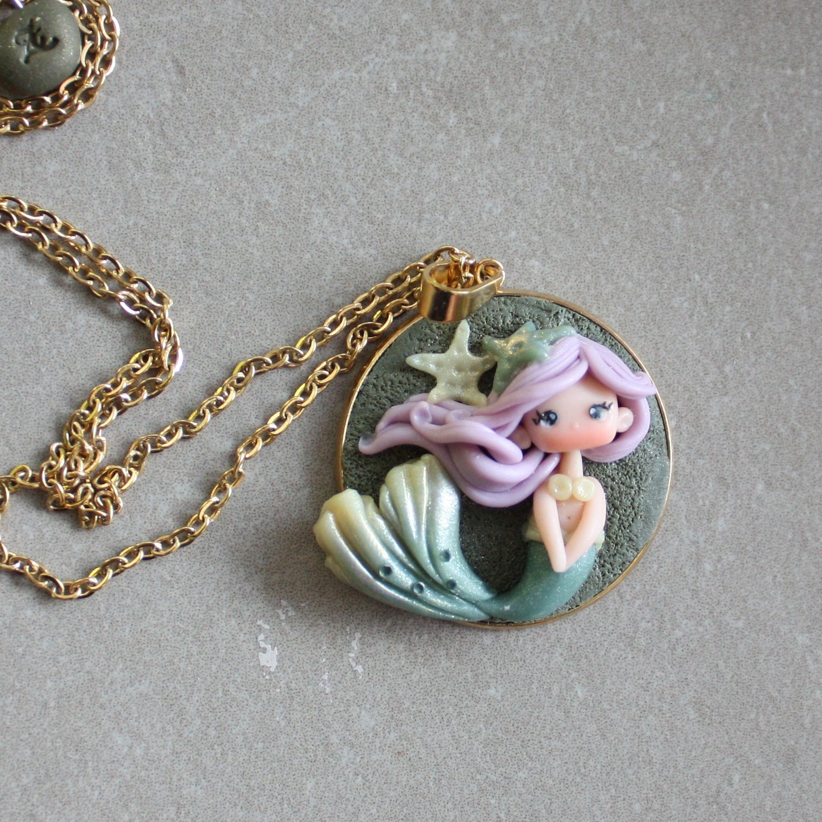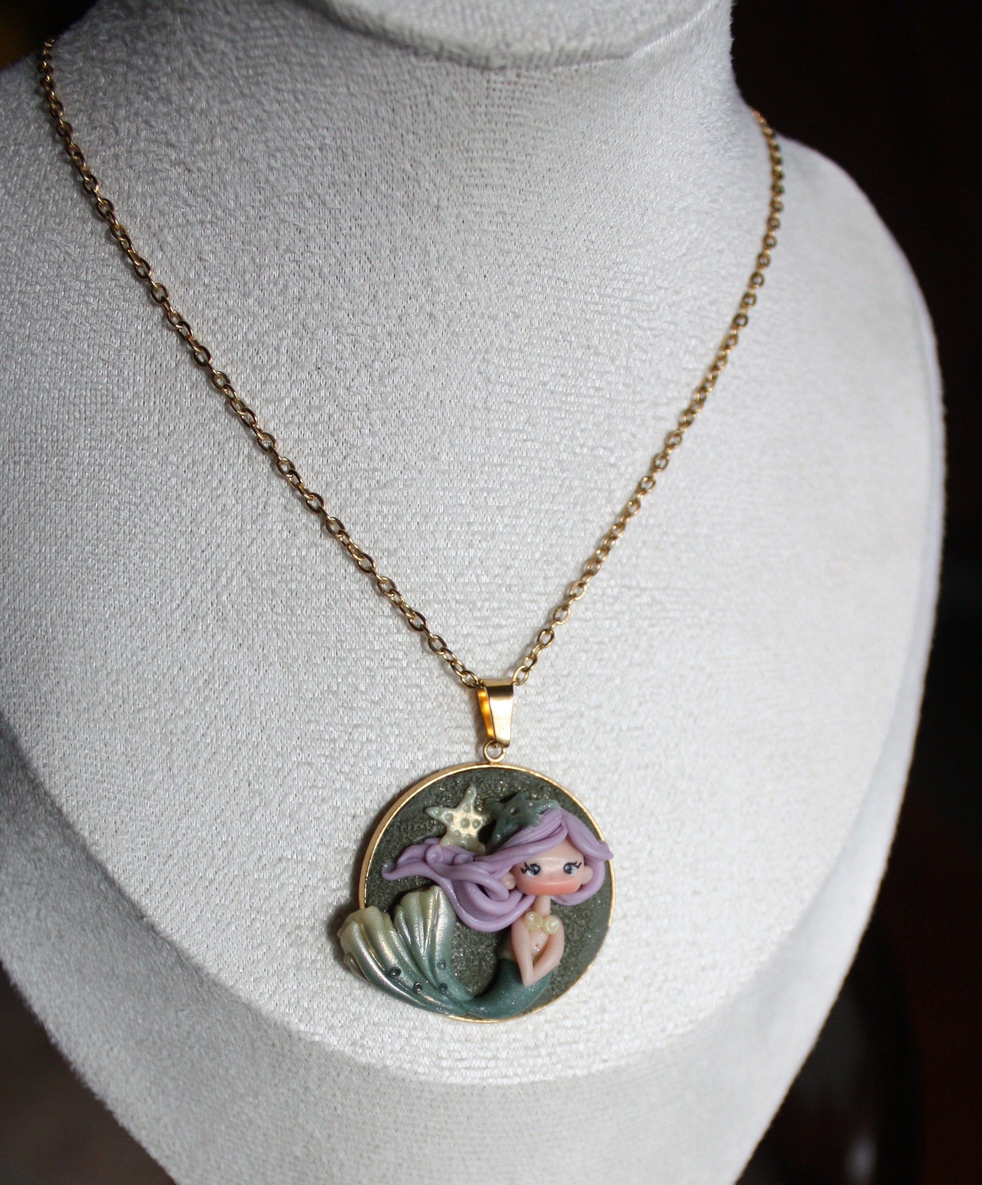 Gold stainless steel necklace with a hand-decorated cameo and a small polymer clay mermaid sculpted without molds.