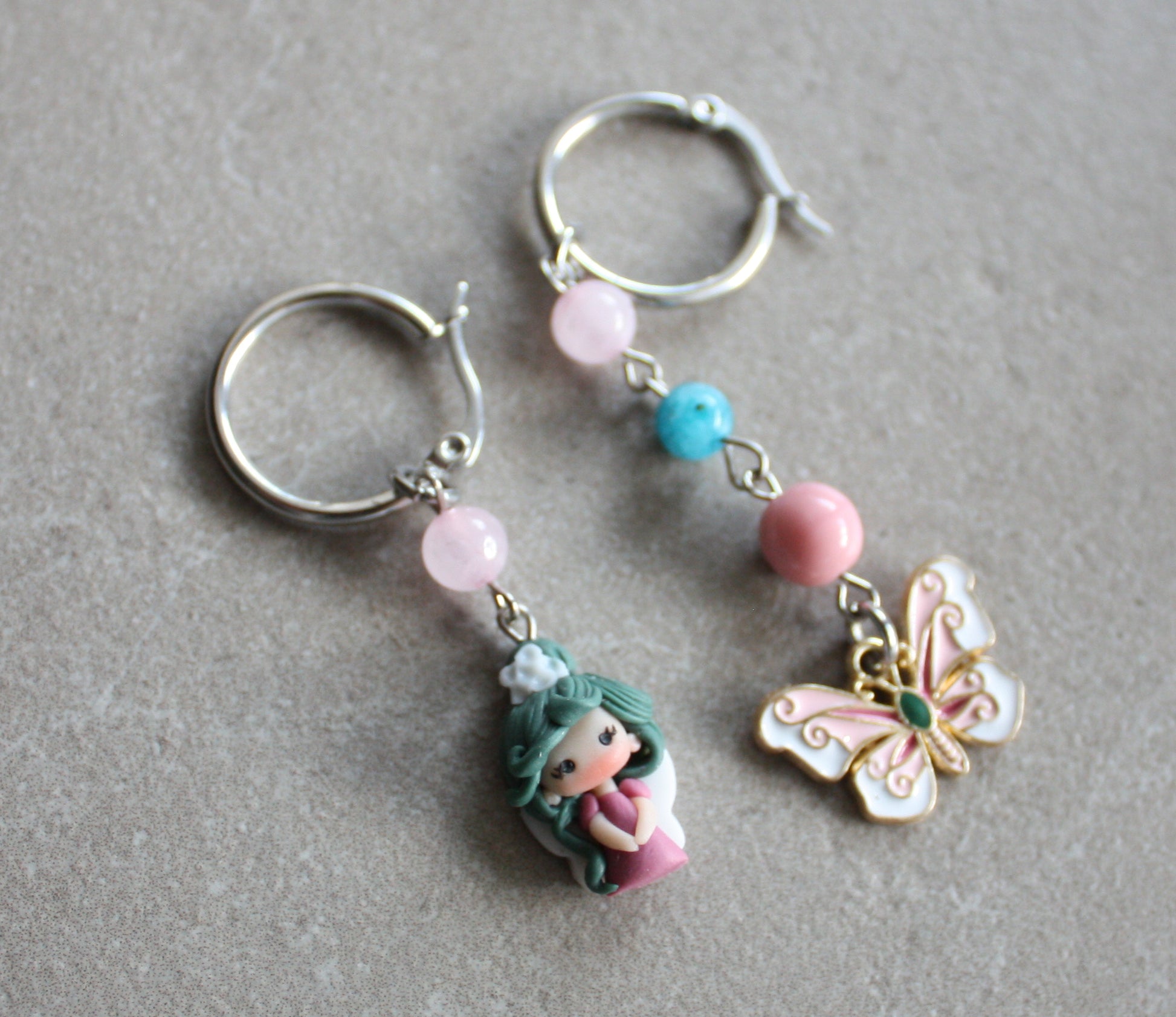Delicate stainless steel earrings, lightweight and durable, featuring an original asymmetric design: on one side, a tiny hand-sculpted polymer clay (fimo) doll; on the other, gemstones and a matching enamel butterfly.