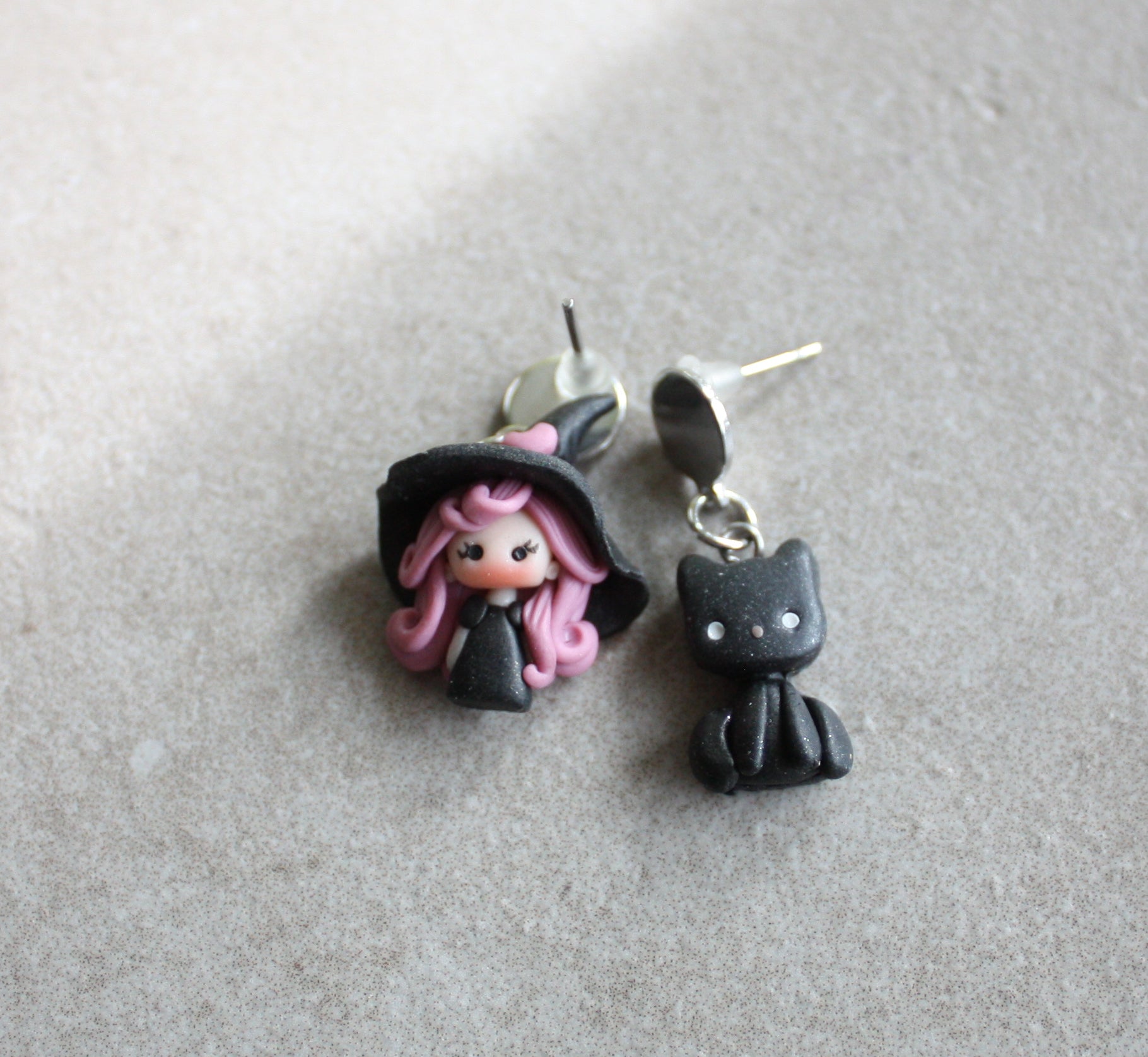 Handmade Polymer Clay Dangle Earrings with Witch and Cat