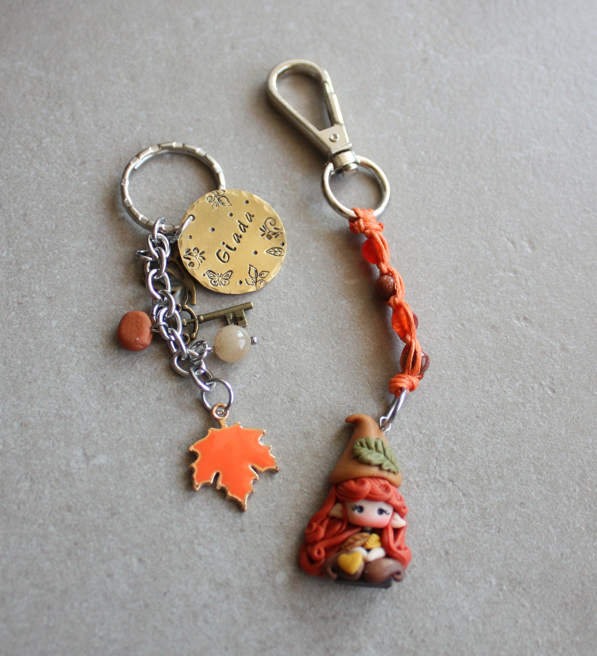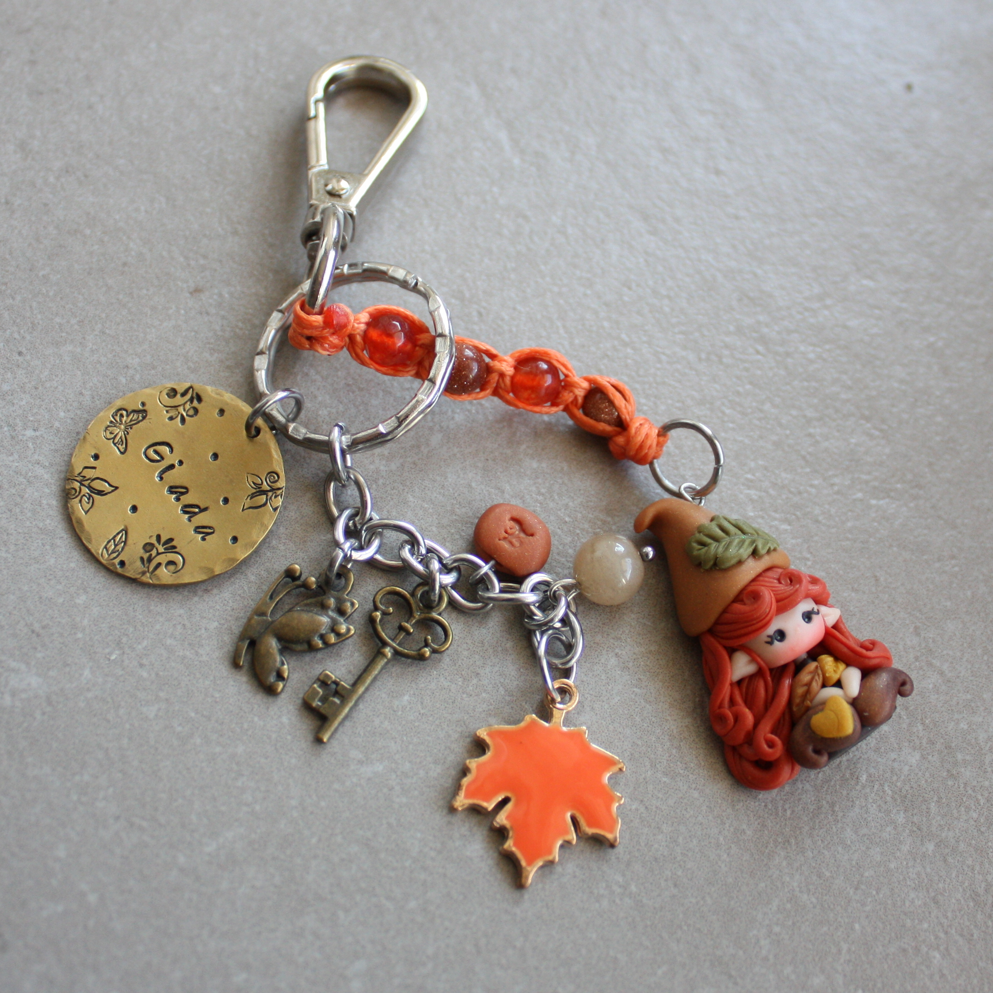 It features a tiny gnome sculpted by hand in polymer clay, paired with a brass tag hand-stamped with a name and a decorative enameled leaf.