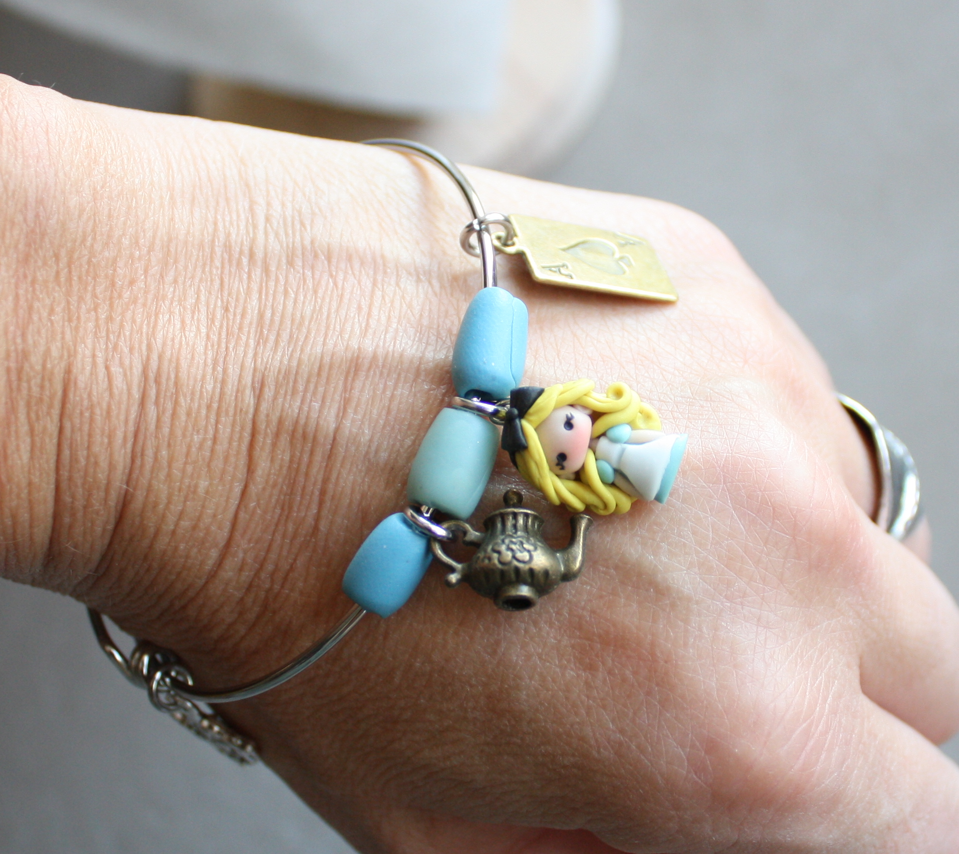 Bracciale bangle rigido in acciaio inox ispirato ad Alice in Wonderland, con ciondoli metallici a tema. Ogni pezzo è assemblato a mano ed è unico e non replicabile.