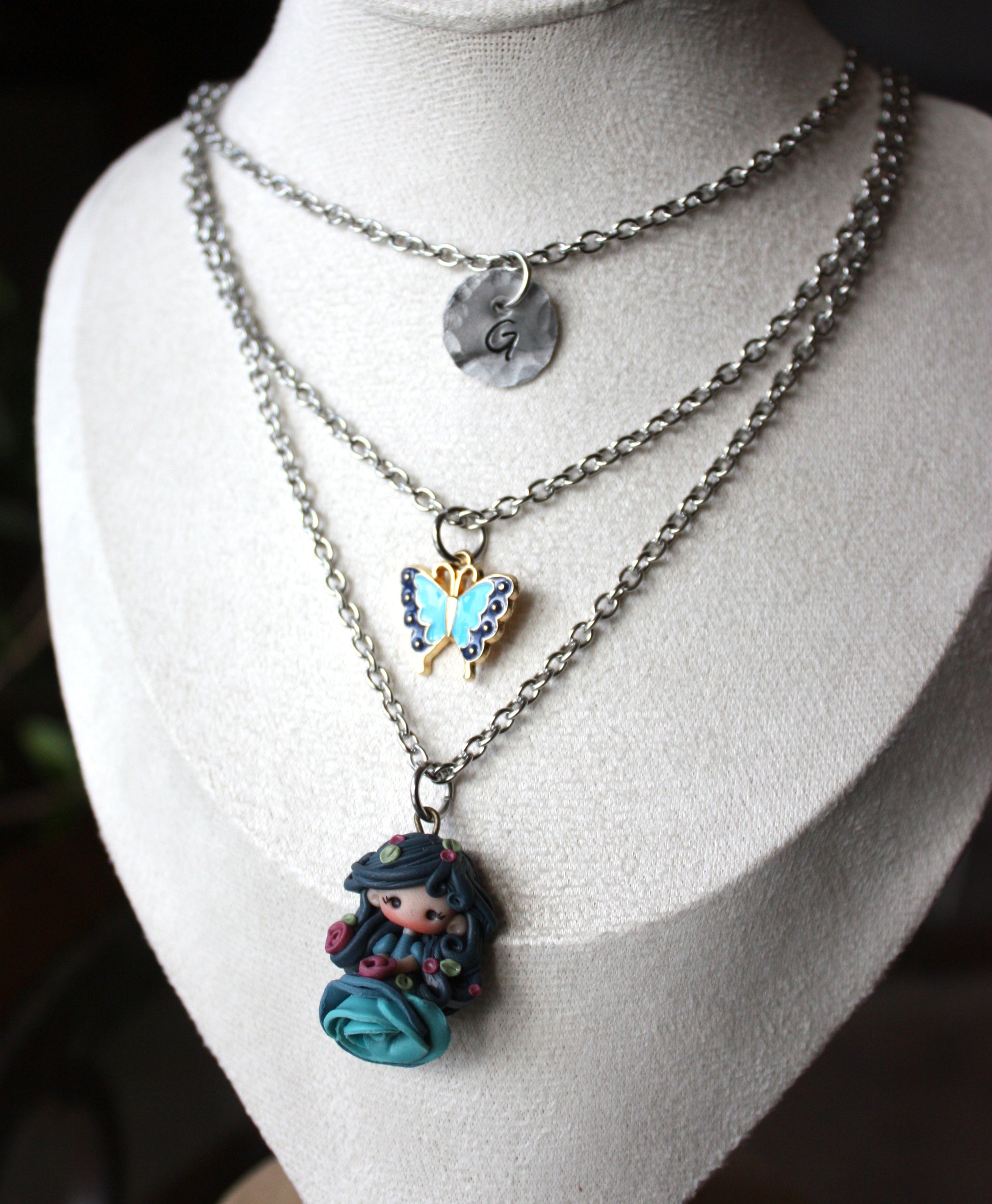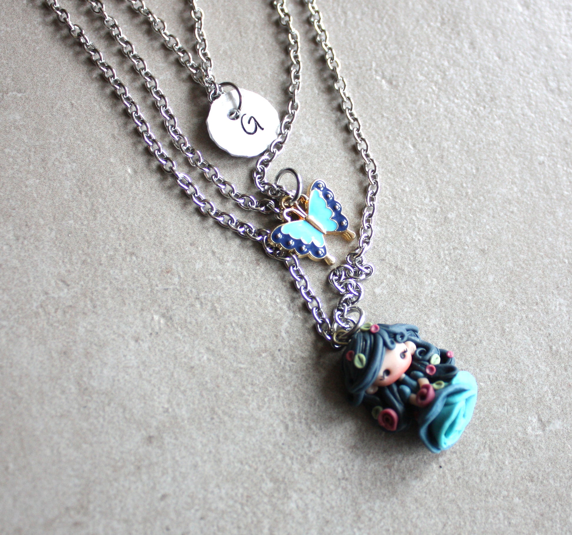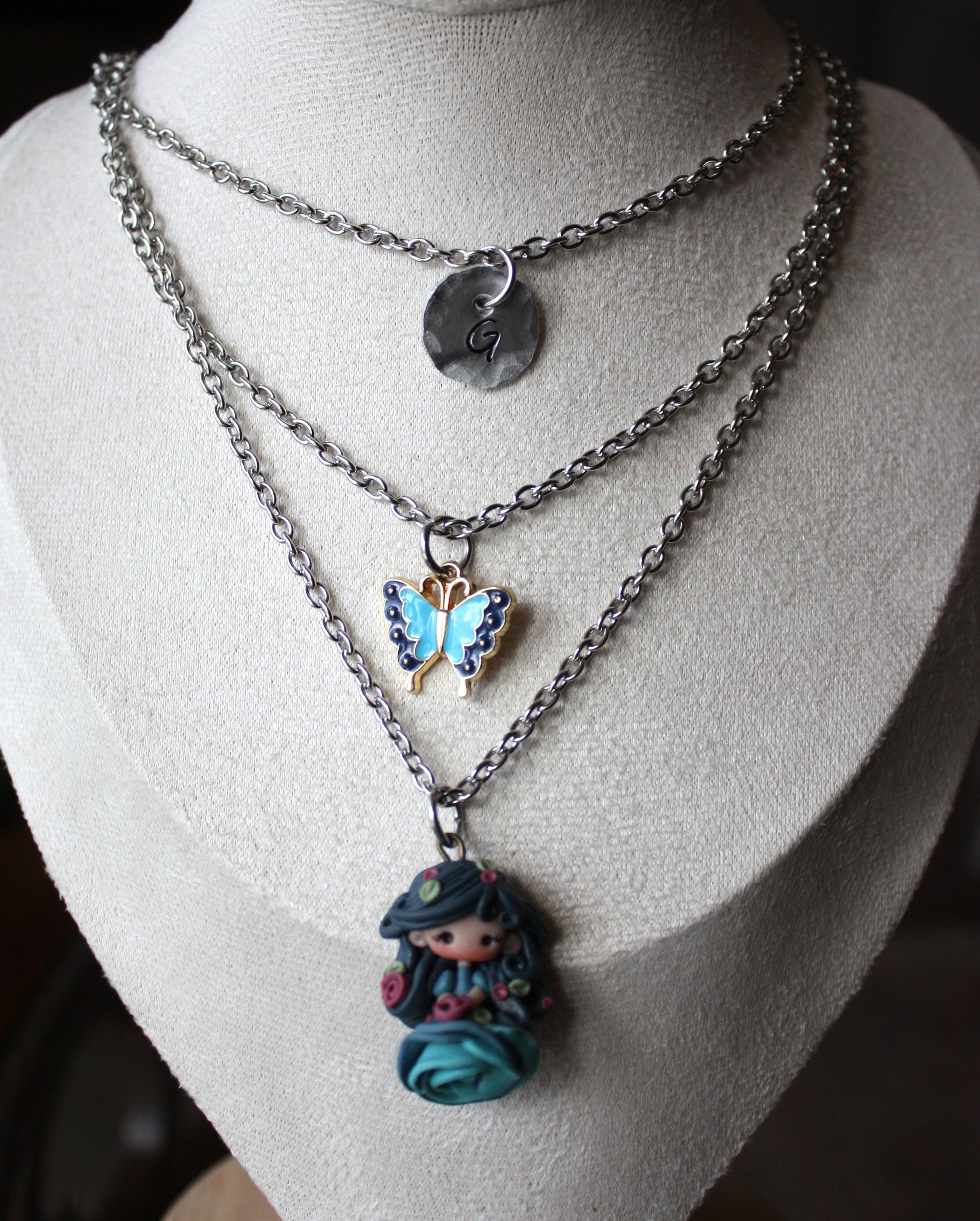 Collana a tre fili in acciaio inox con lettera e ninfa blu