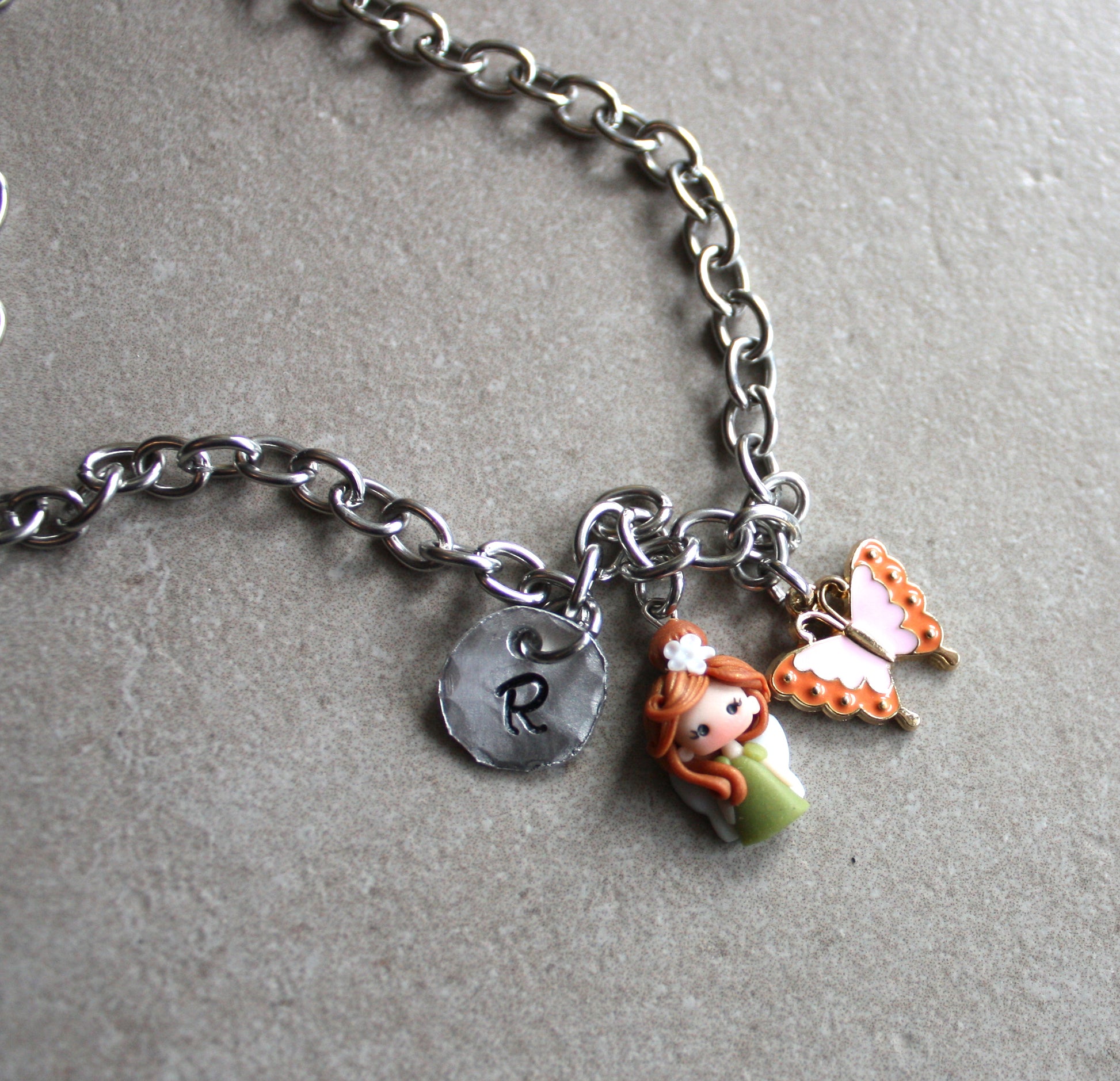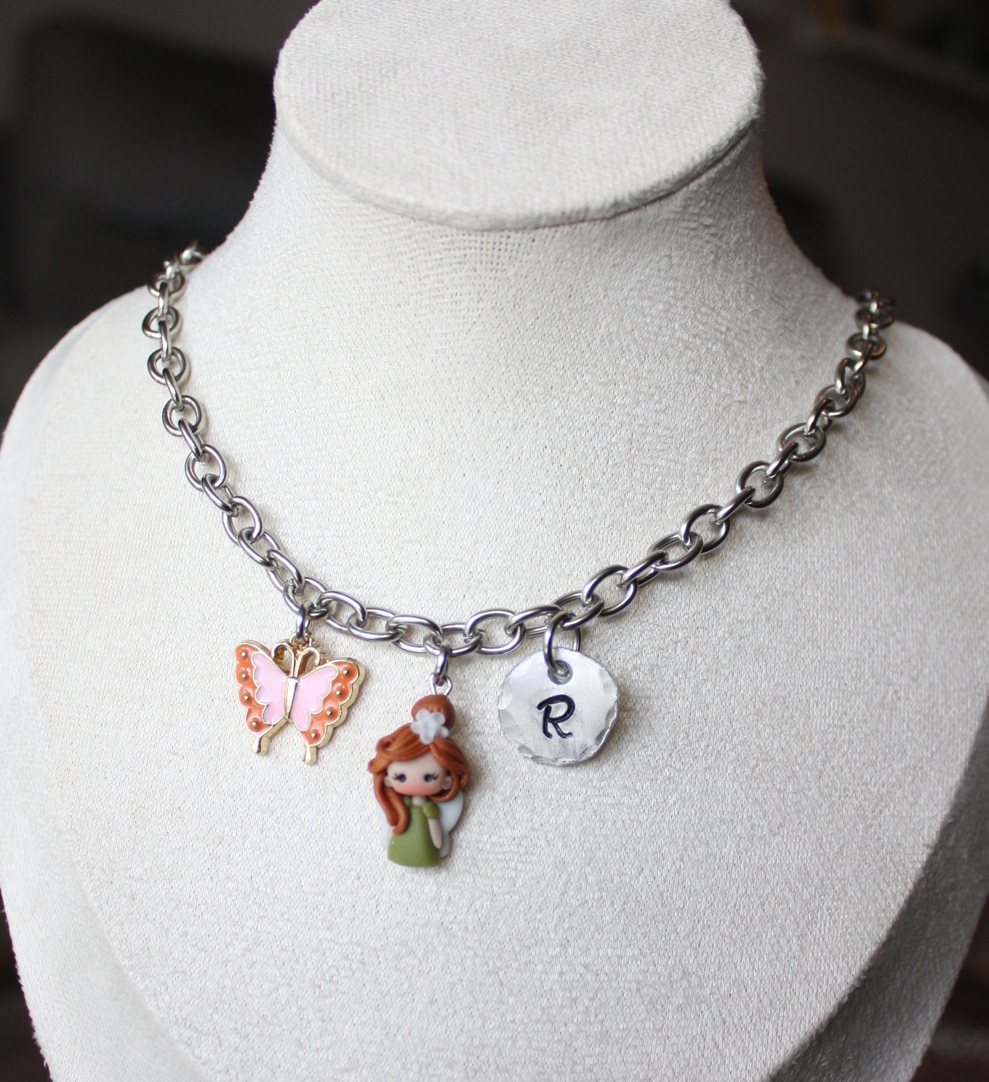 Lettera incisa a mano, fatina in pasta polimerica modellata a mano, e piccola farfalla smaltata abbinata.