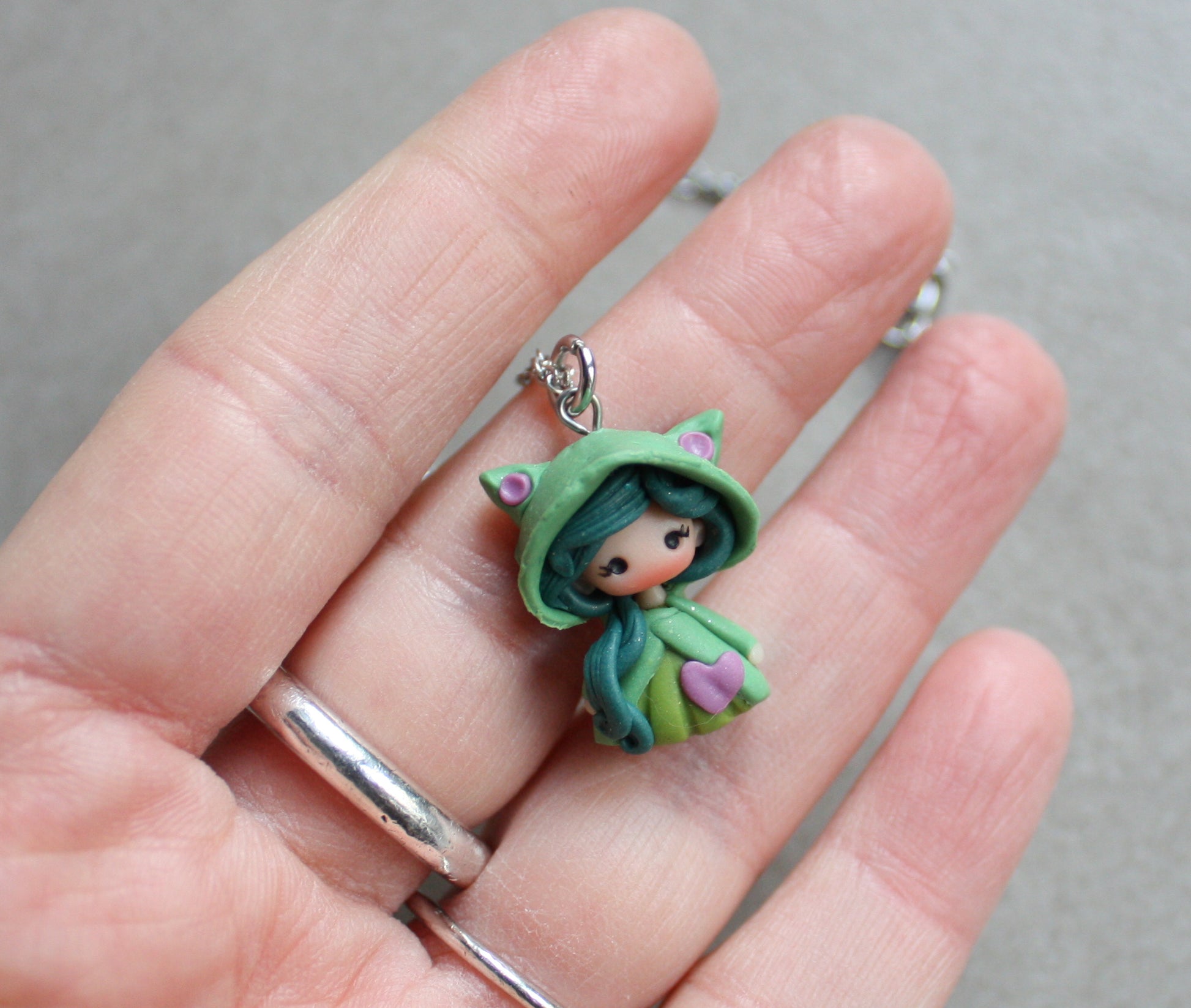 Collana in acciaio inox con cat doll in fimo modellata a mano II