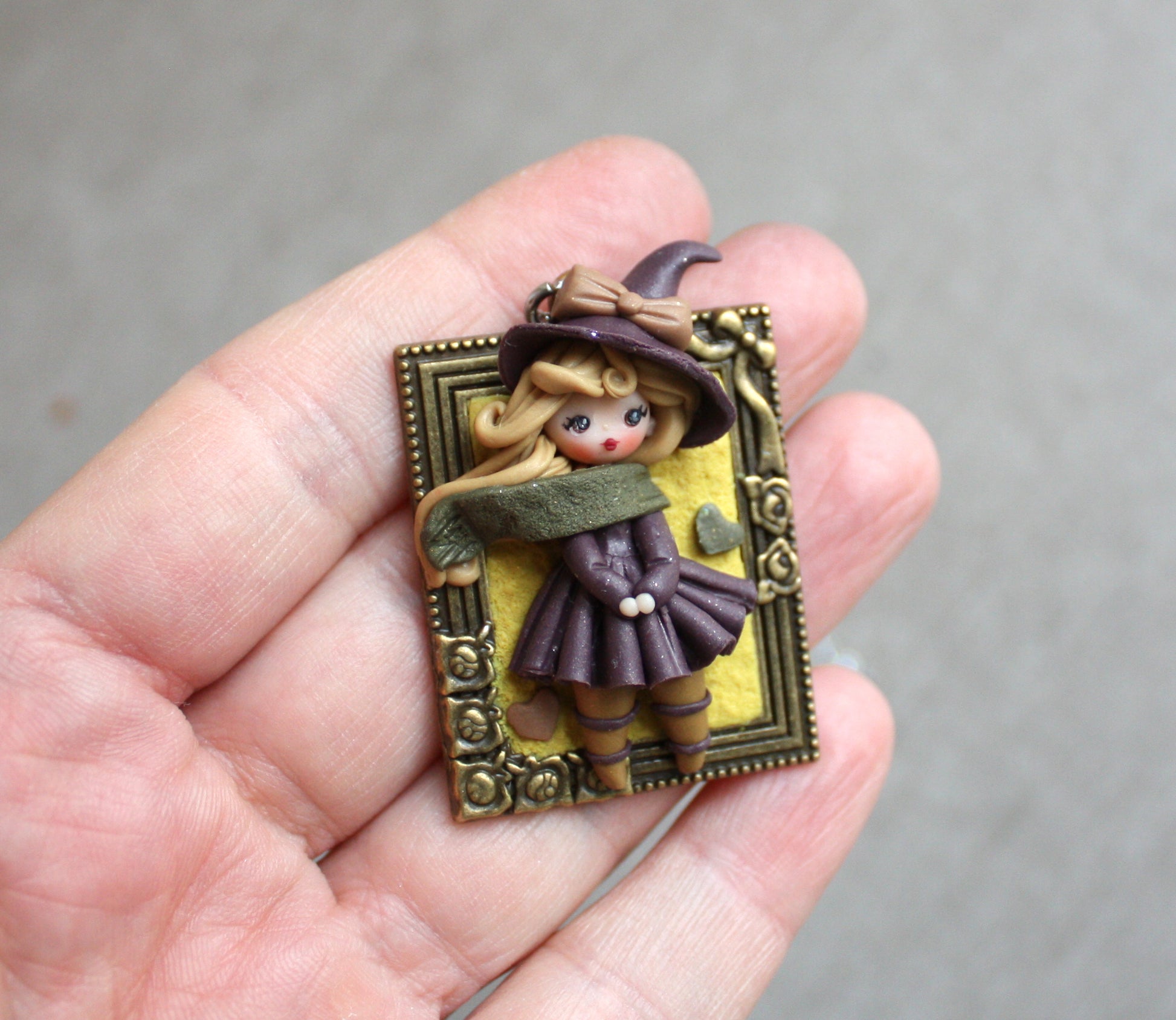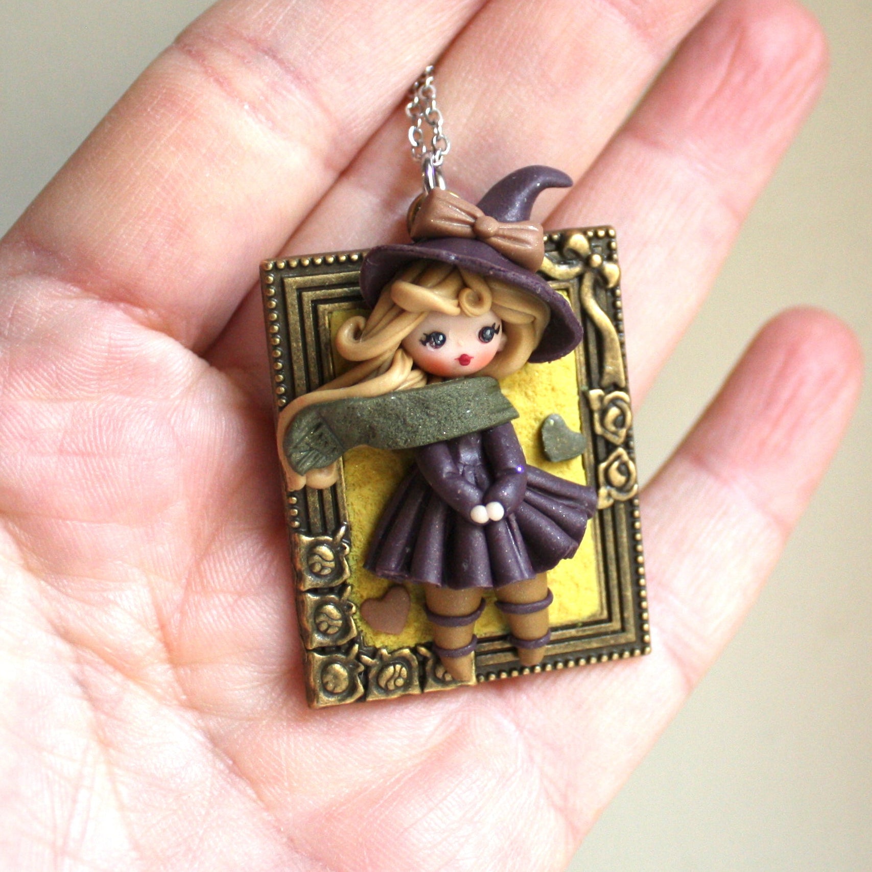 Collana in acciaio inox con piccola streghetta modellata a mano in pasta polimerica (fimo).