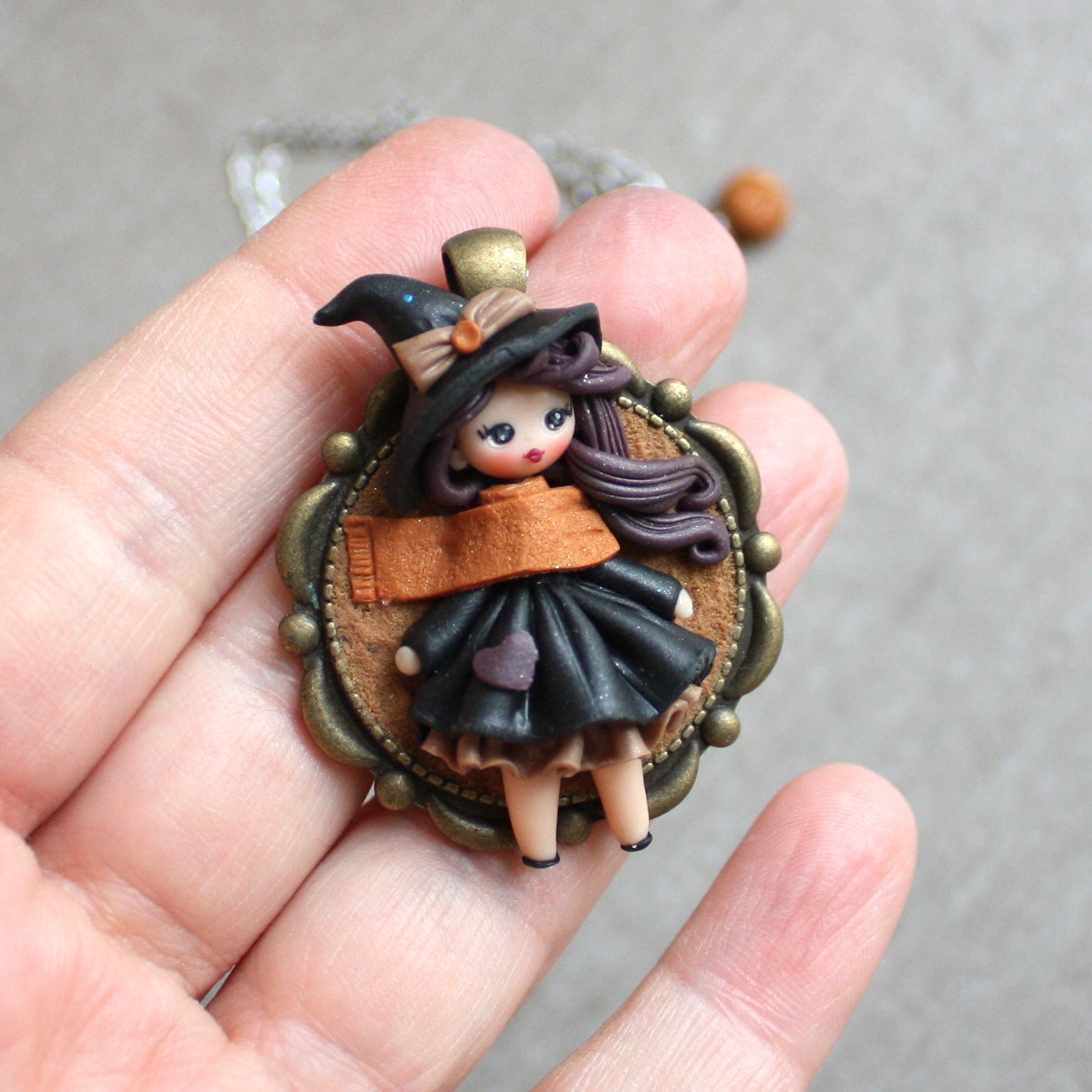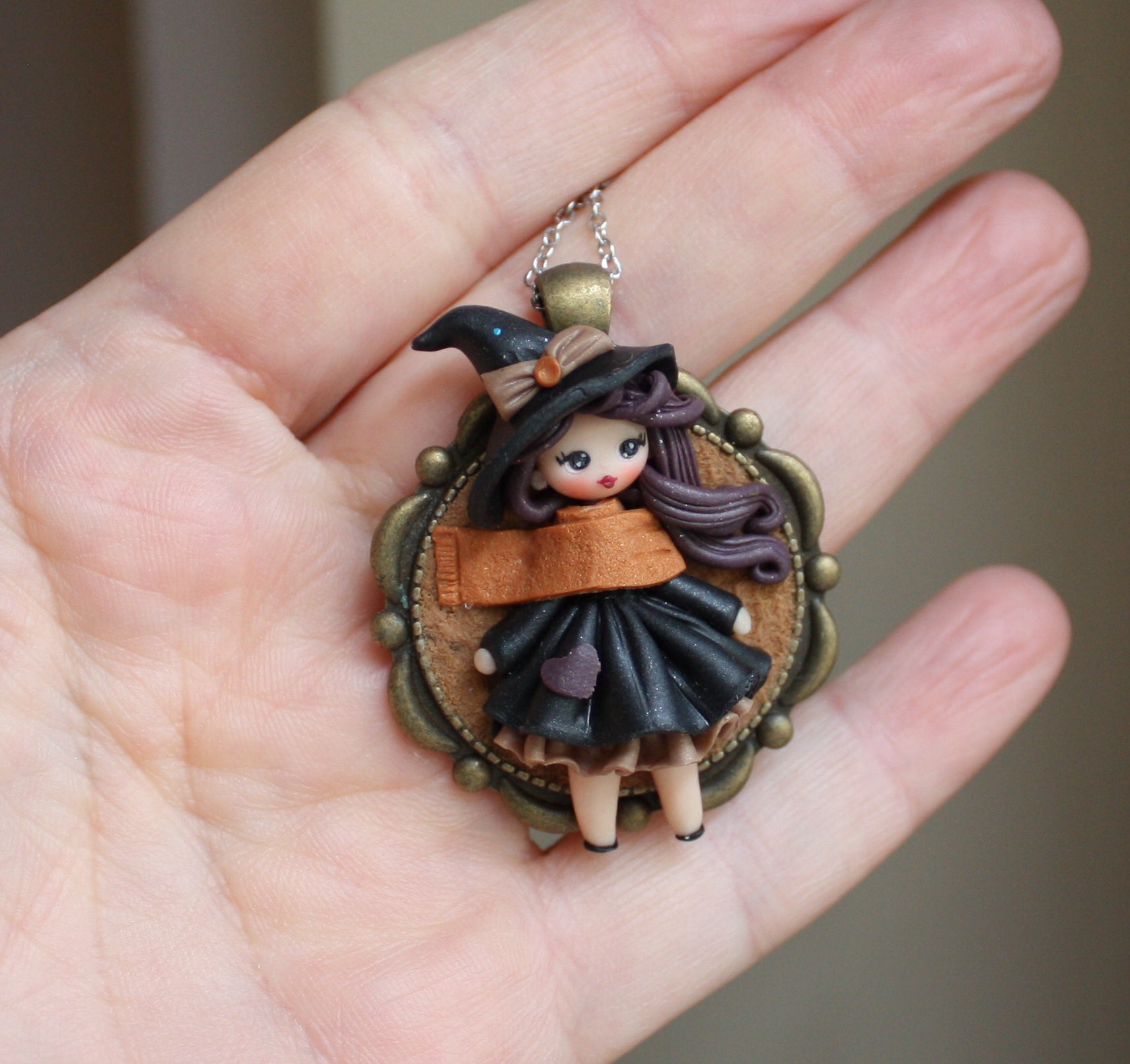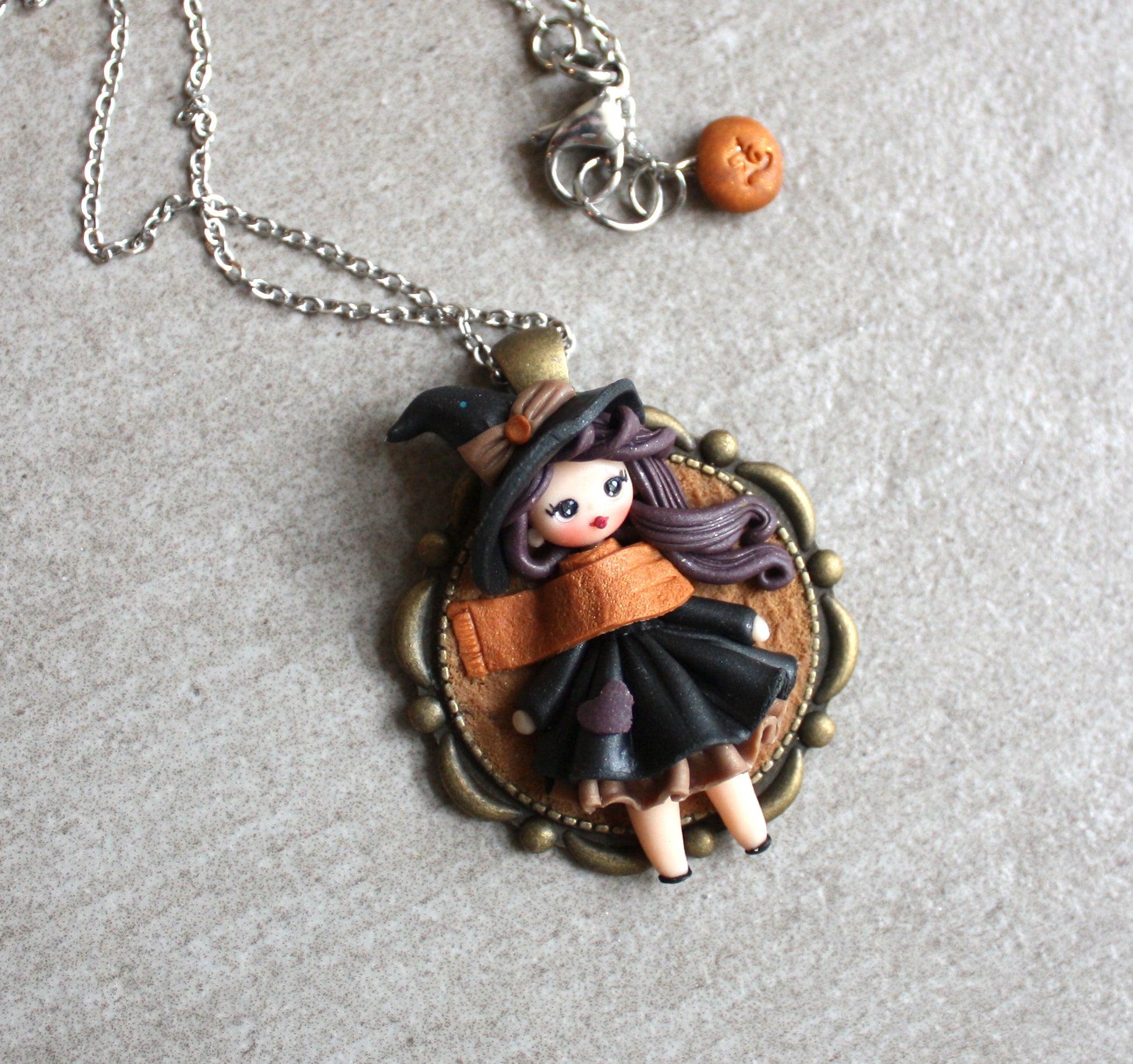 Collana in acciaio inox con piccola streghetta modellata a mano in pasta polimerica (fimo).