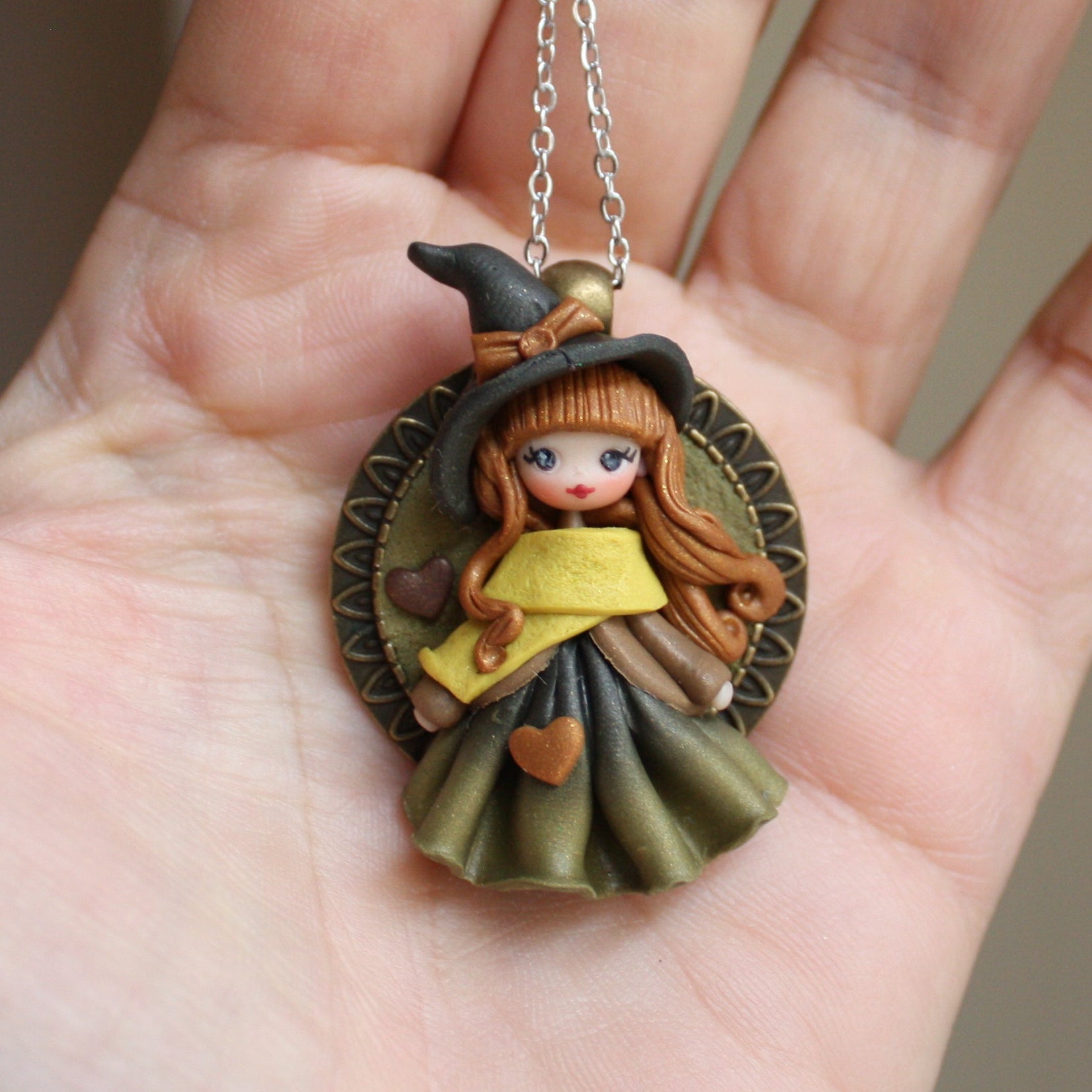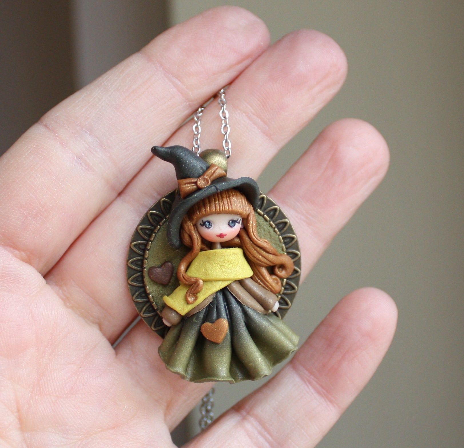 Collana in acciaio inox con piccola streghetta modellata a mano in pasta polimerica (fimo).