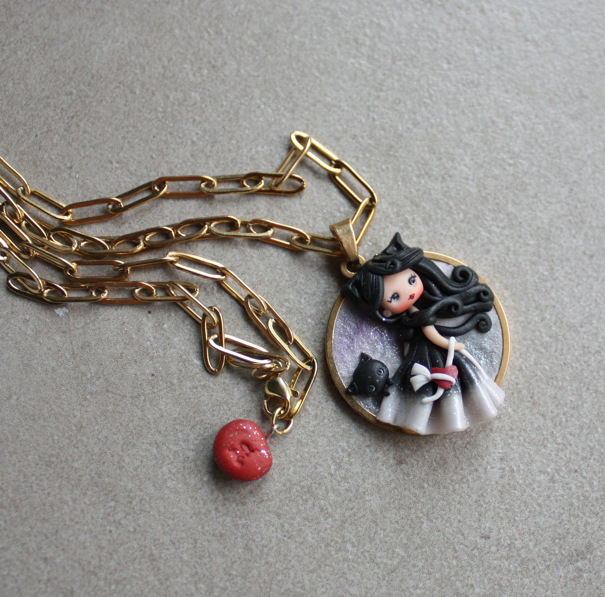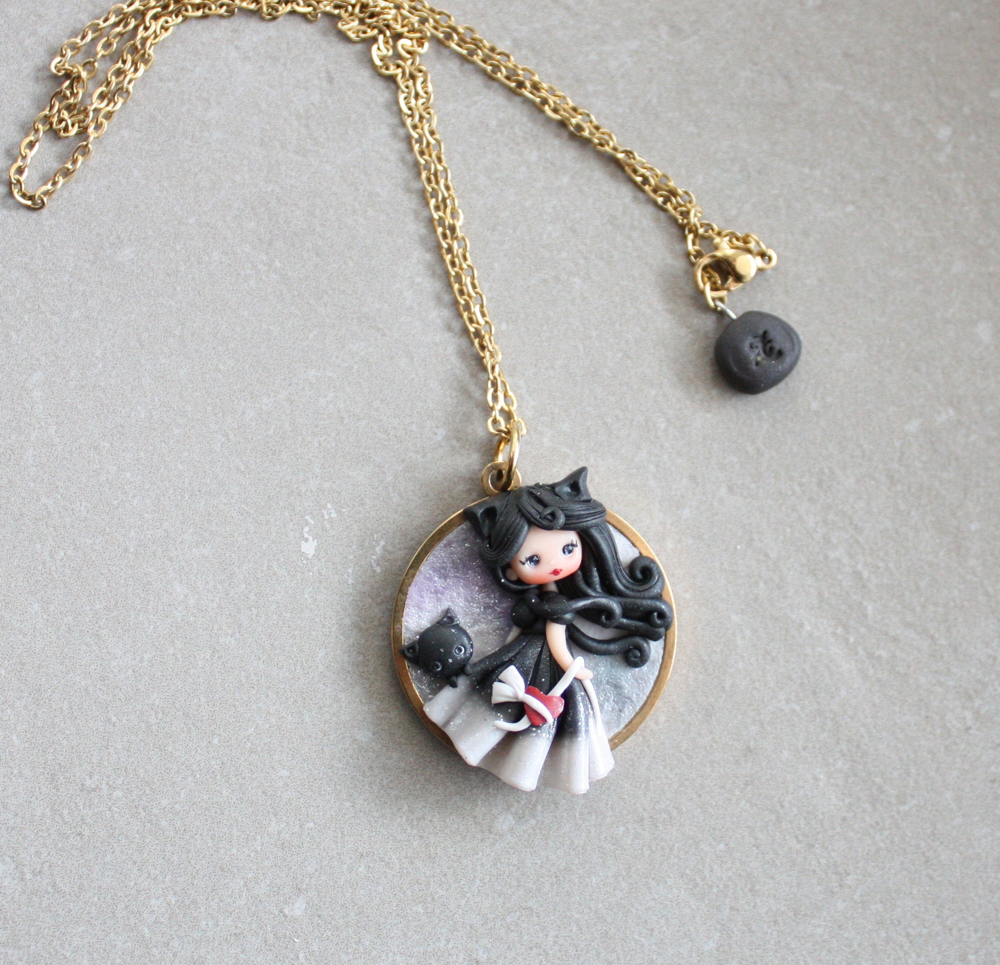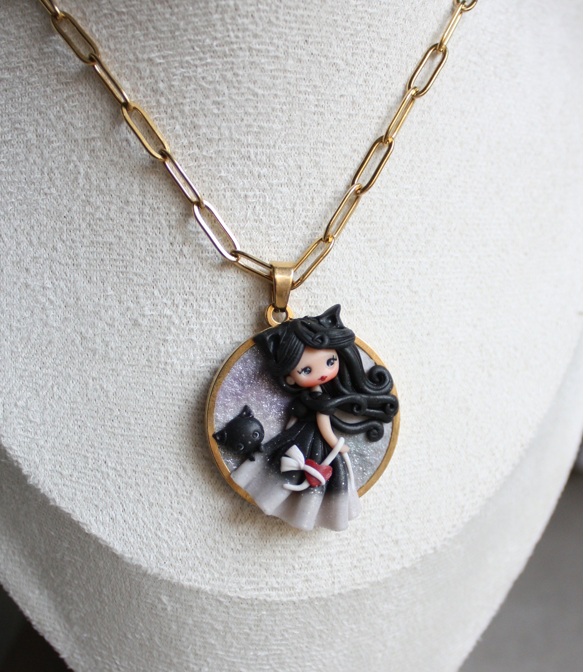Collana in acciaio inox dorato con cammeo in acciaio inox decorato a mano e piccola cat doll modellata in pasta polimerica (fimo).