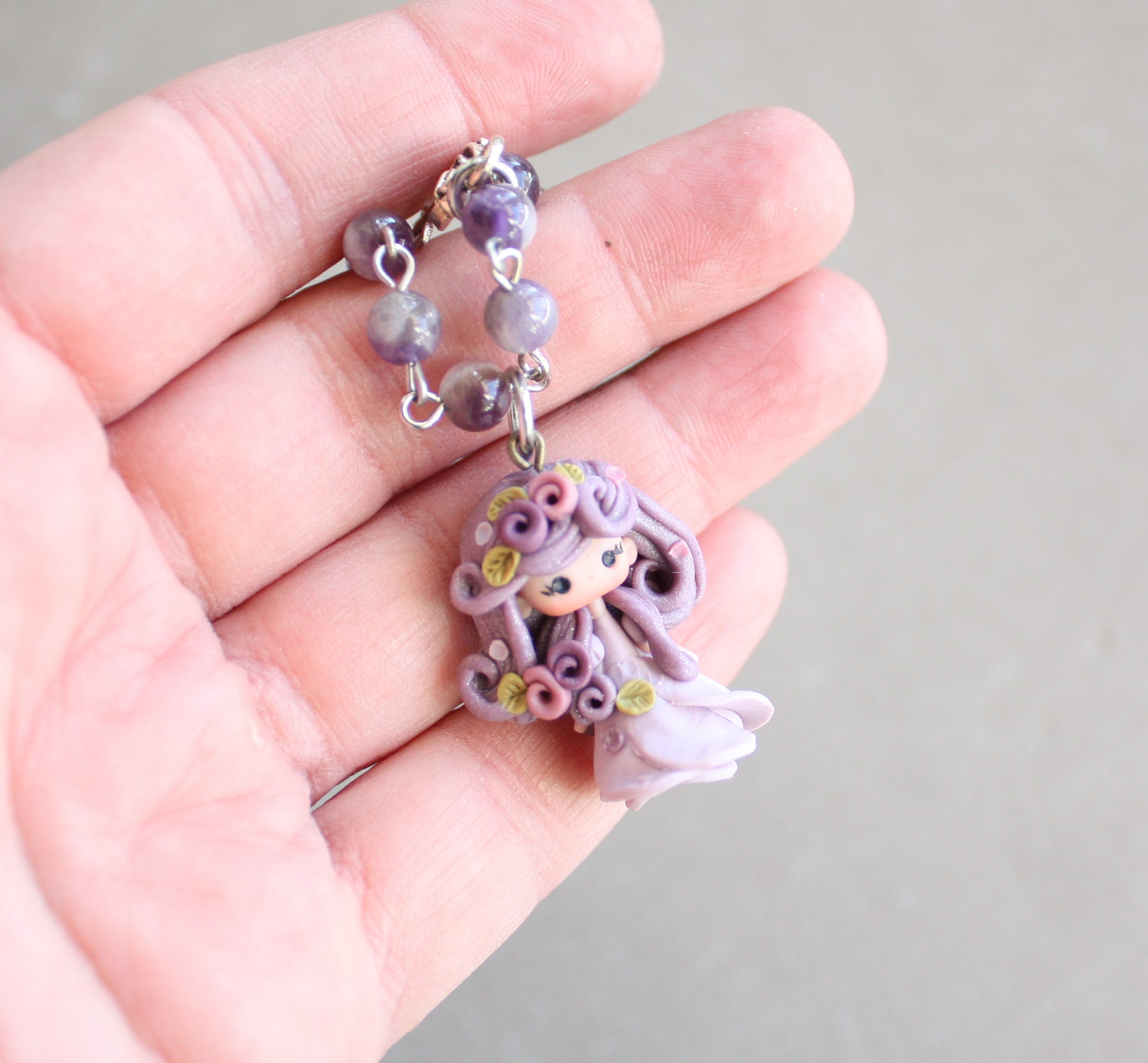Collana in acciaio inox con pietre dure e una mini bambolina modellata a mano in pasta polimerica.
