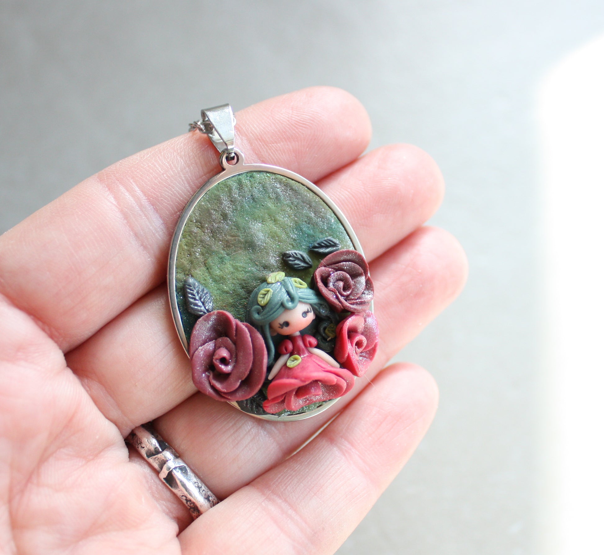Collana con catena in acciaio inox (55 cm) e cammeo artigianale in pasta polimerica.