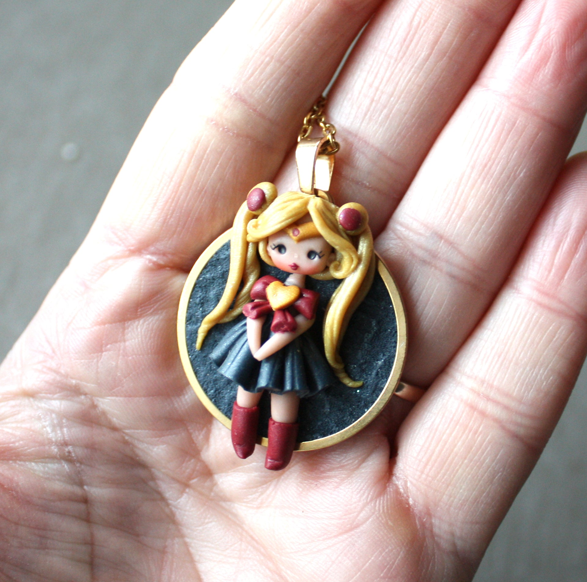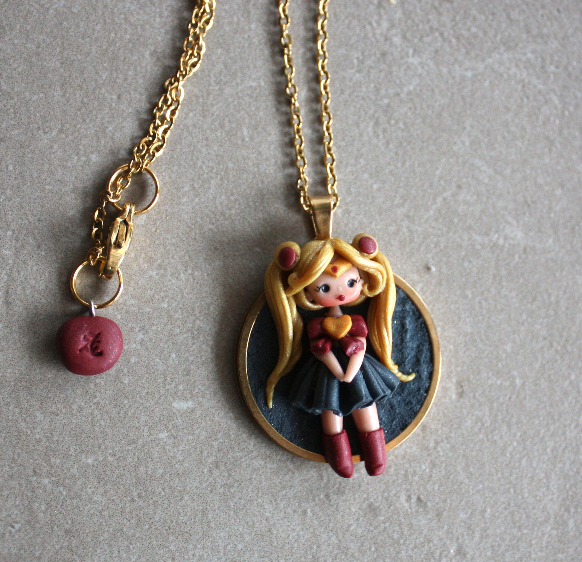 Collana in acciaio inox dorato, dedicata alla guerriera della luna Sailor Moon, modellata interamente a mano in pasta polimerica.