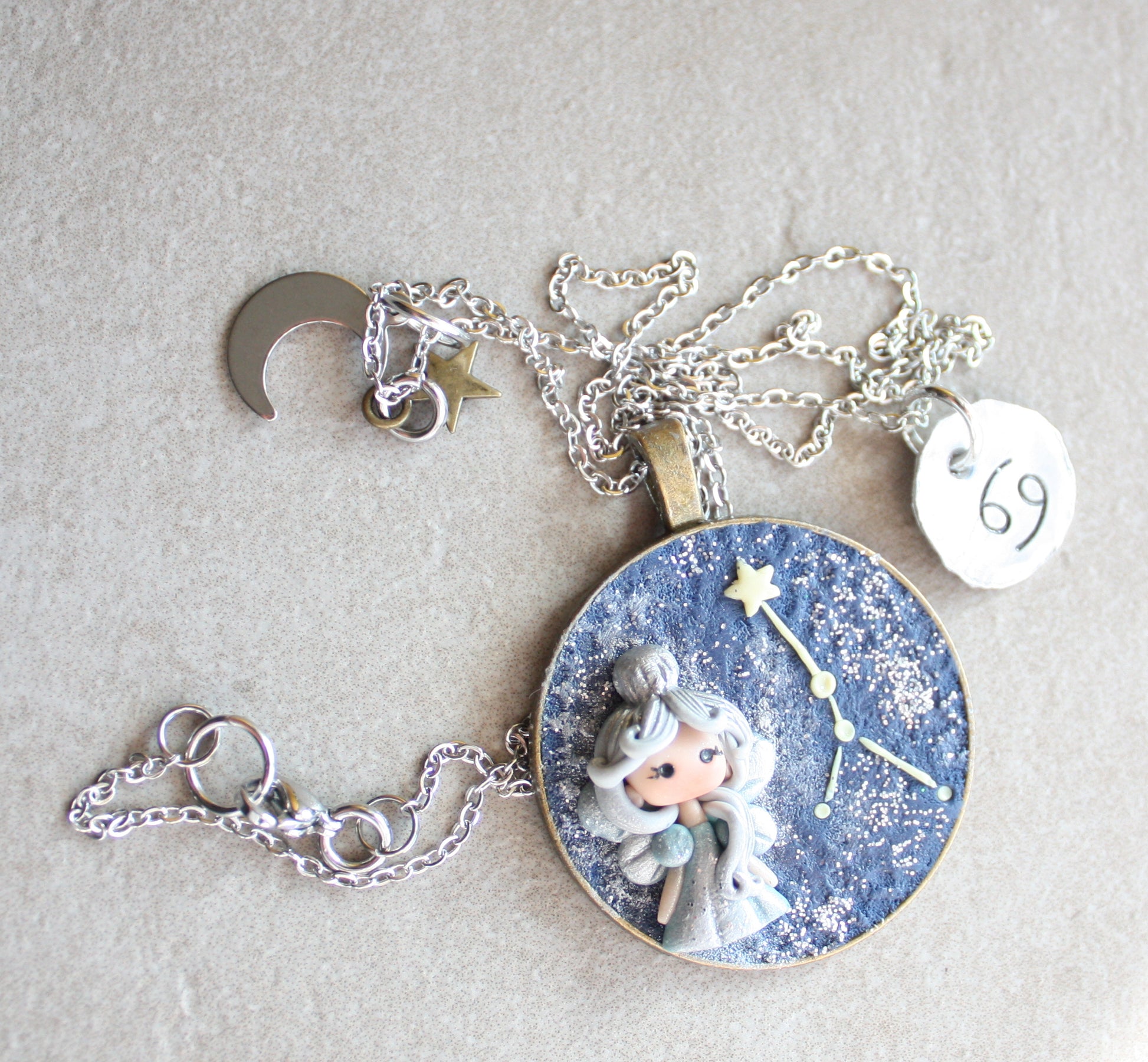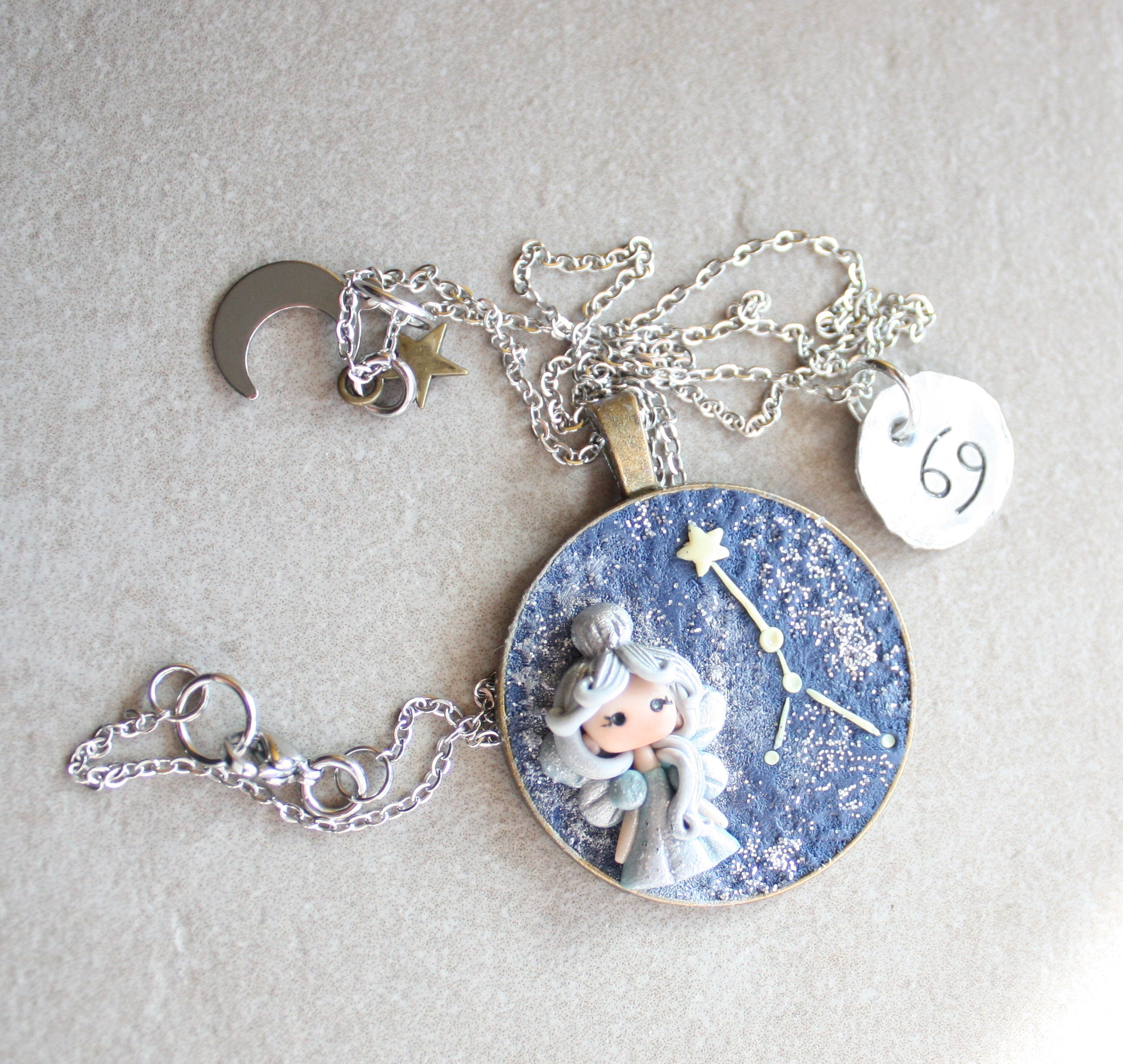 La fatina è modellata a mano nei colori del segno, con uno sfondo che riproduce la sua costellazione.