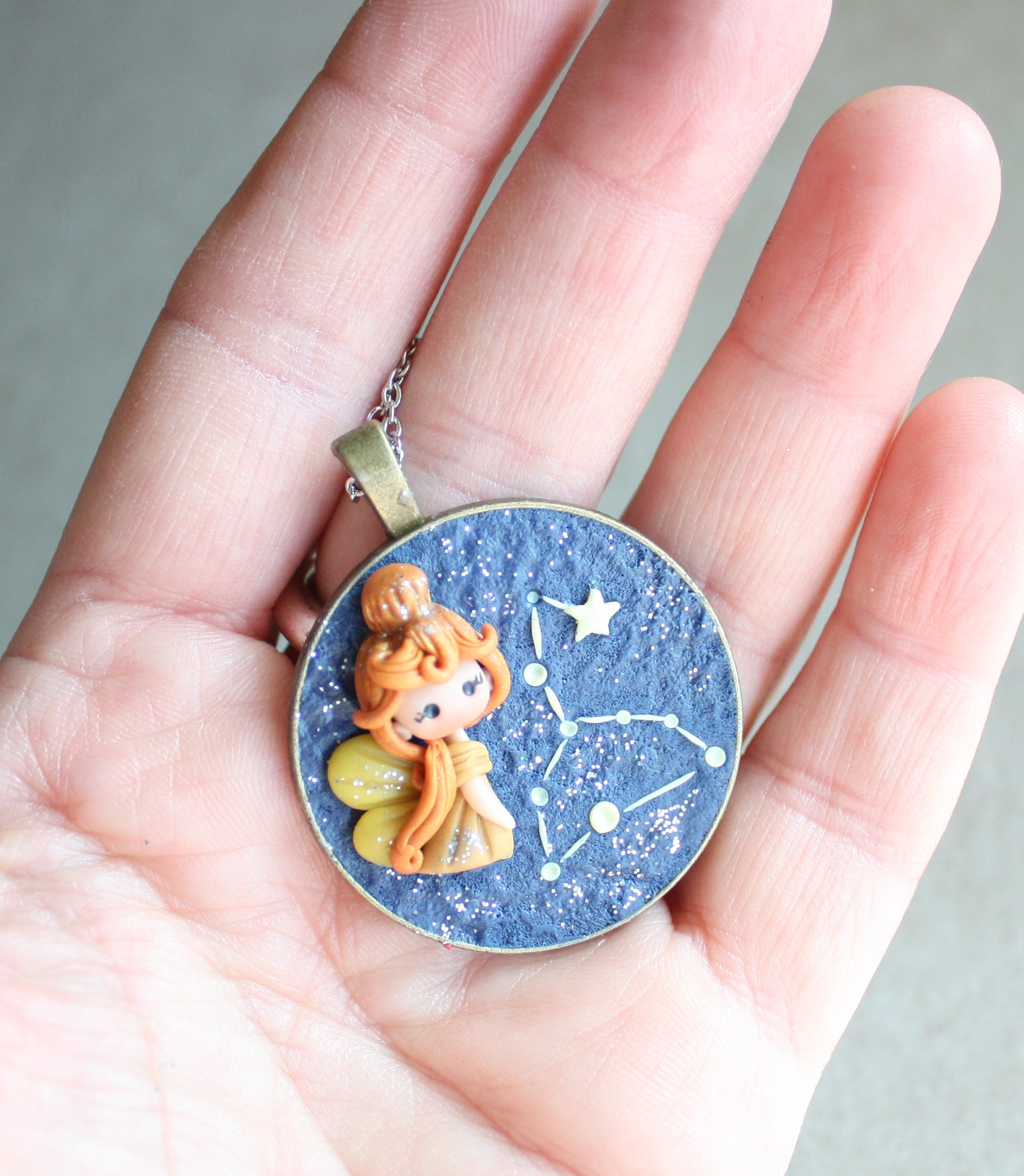 La fatina è modellata a mano nei colori del segno, con uno sfondo che riproduce la sua costellazione.