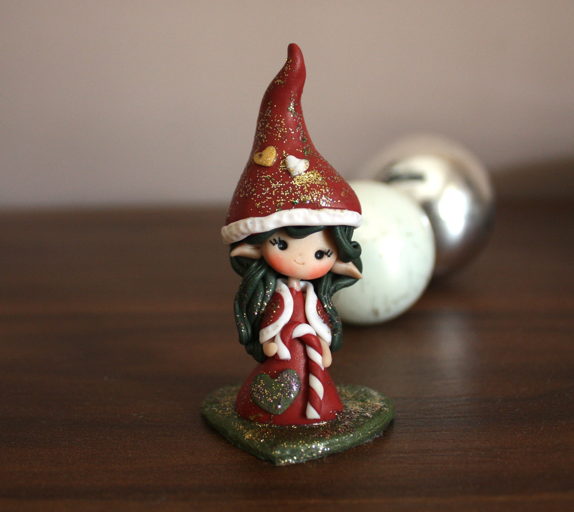 Una piccola gnoma natalizia modellata interamente a mano in pasta polimerica (fimo), pensata per chi ama i dettagli delicati e le decorazioni artigianali.
