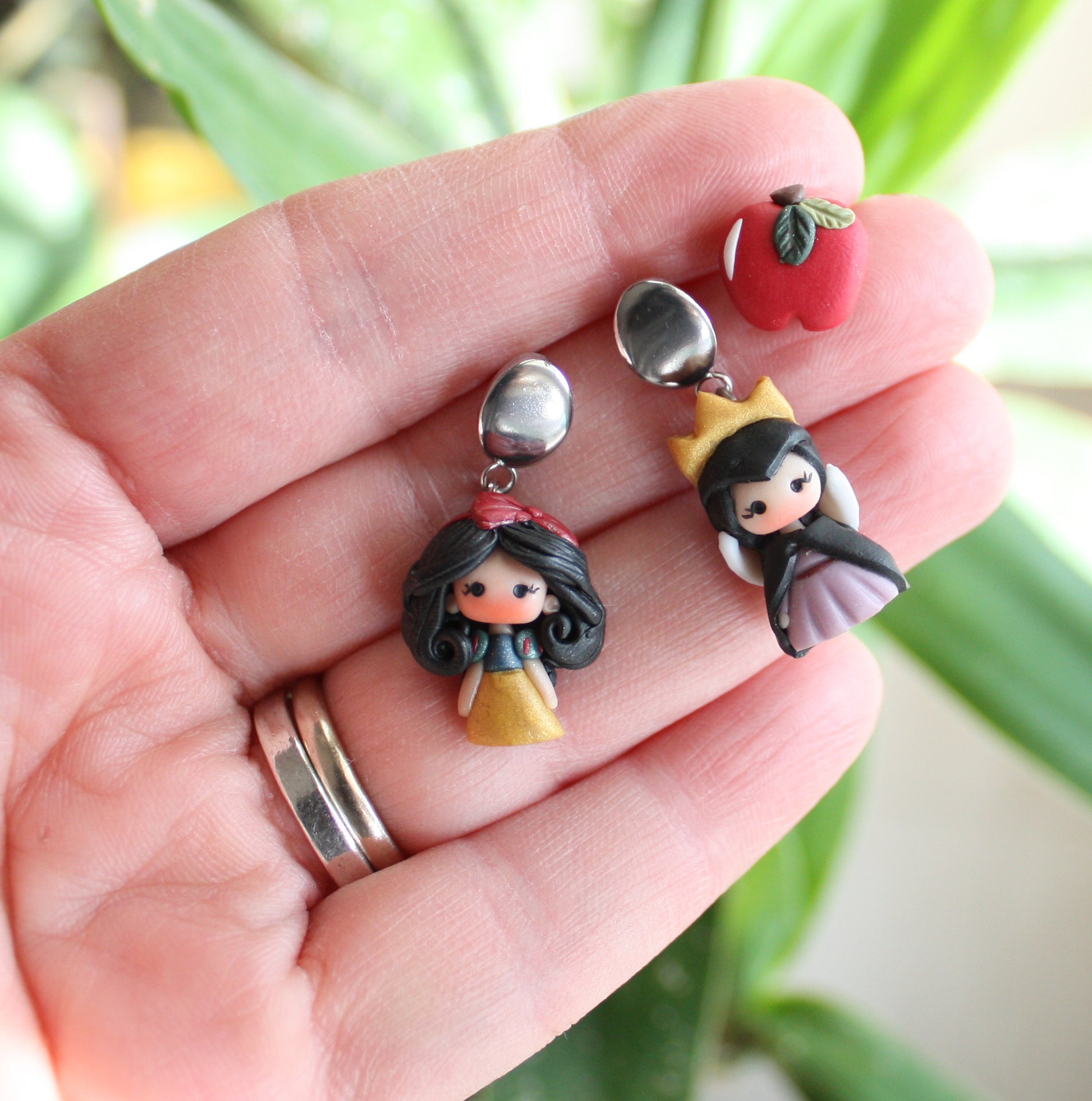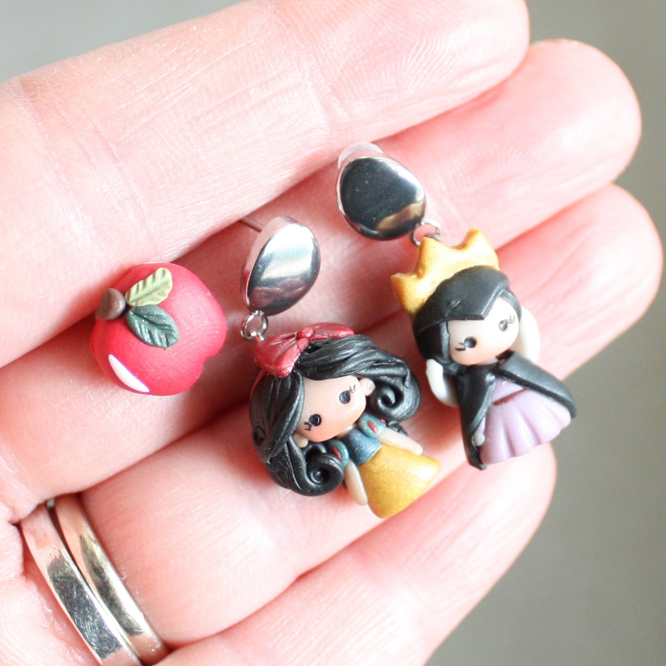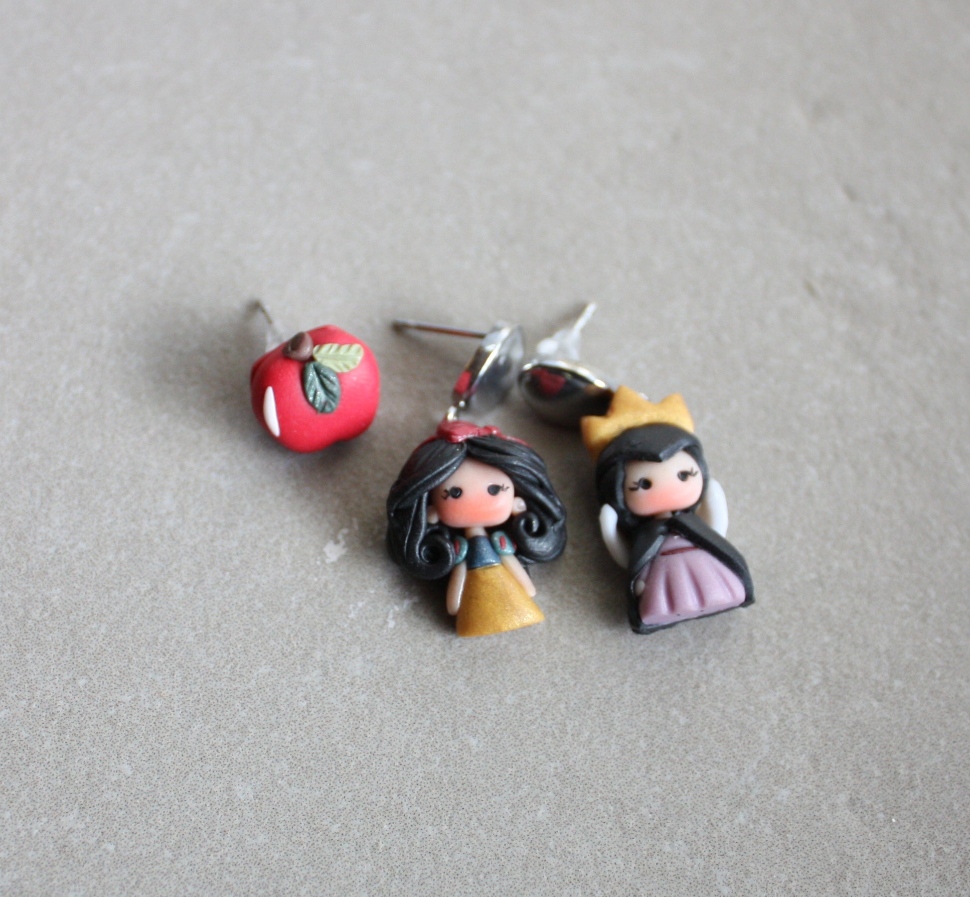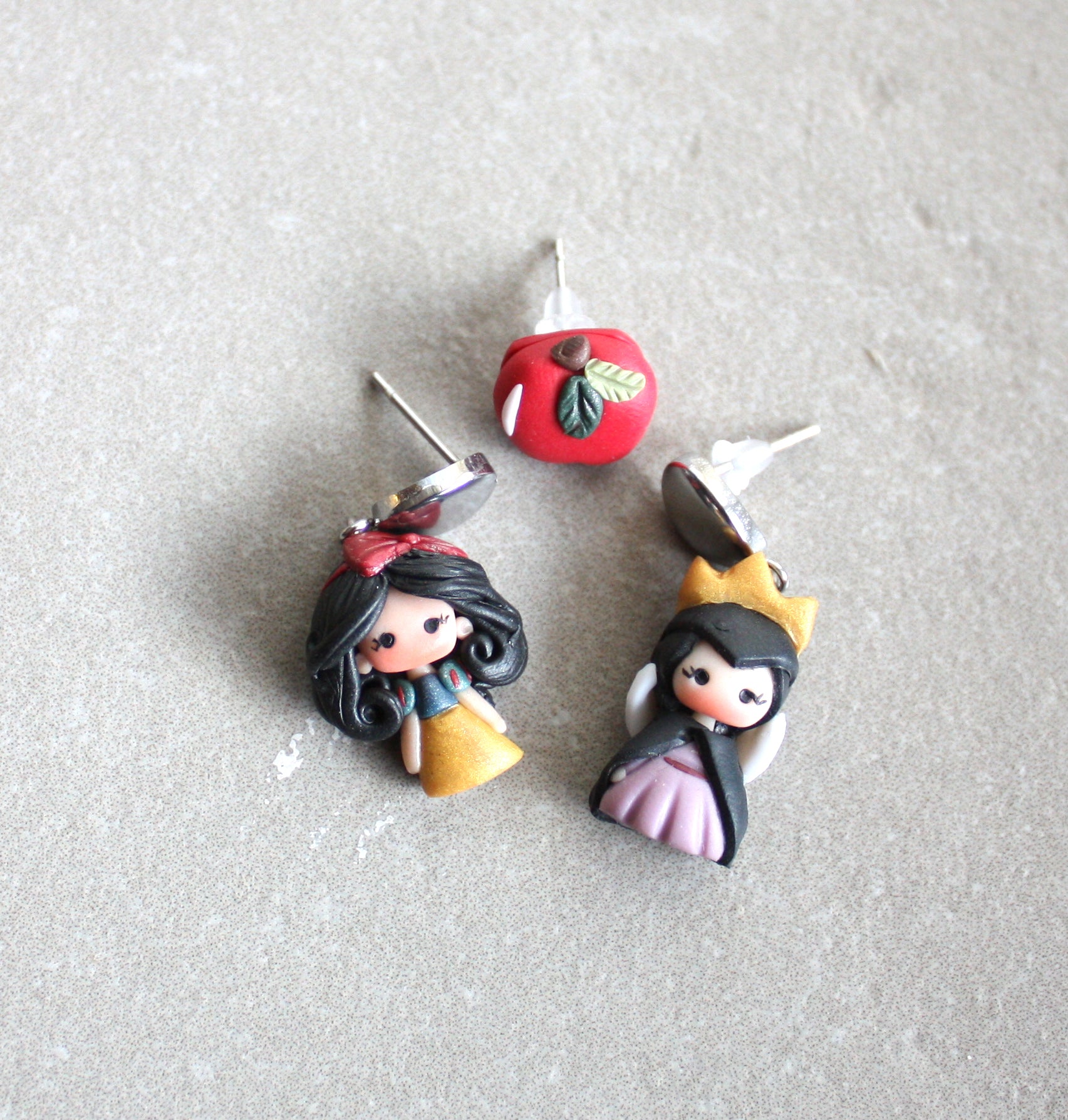Set di orecchini asimmetrici in acciaio inox, ispirati alla fiaba di Biancaneve.