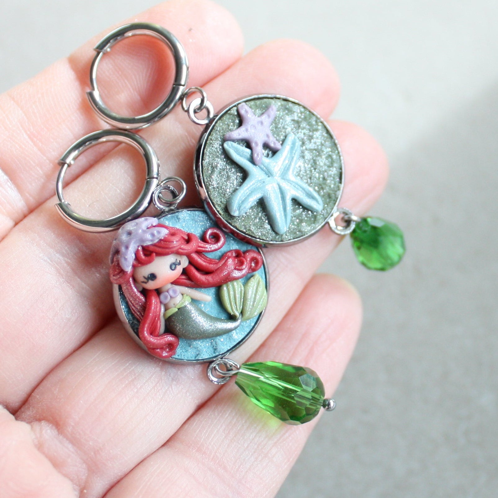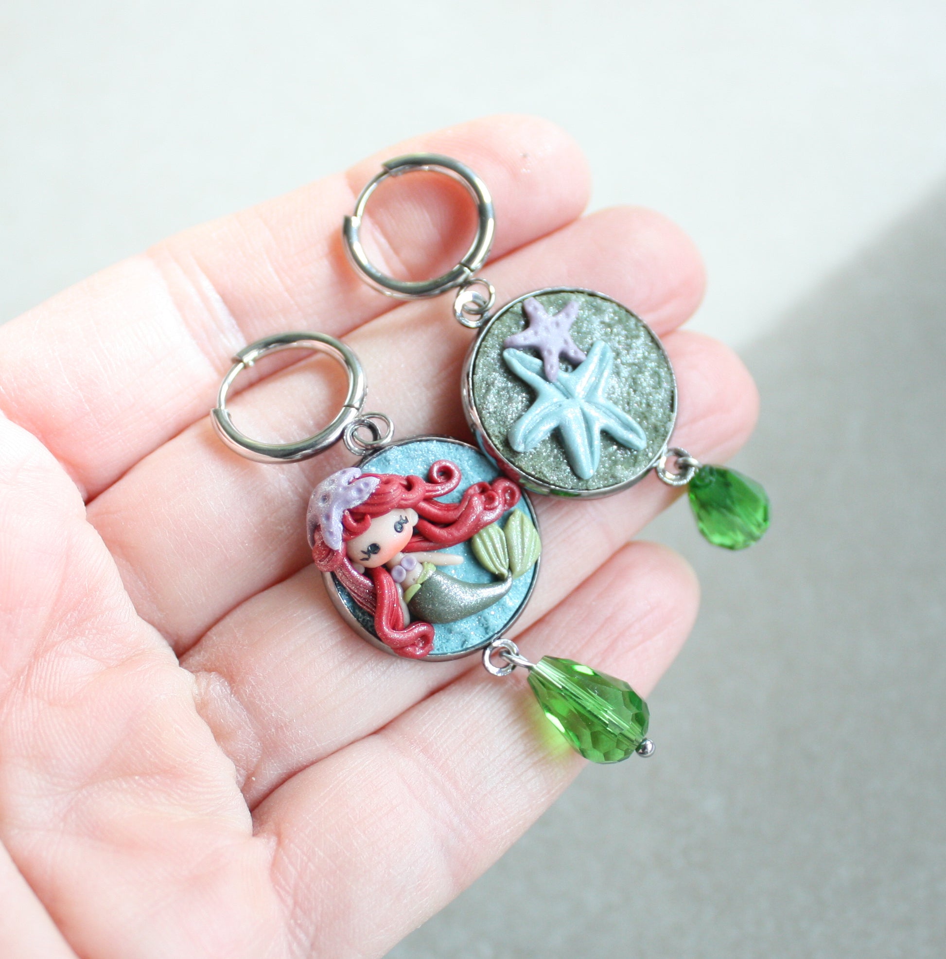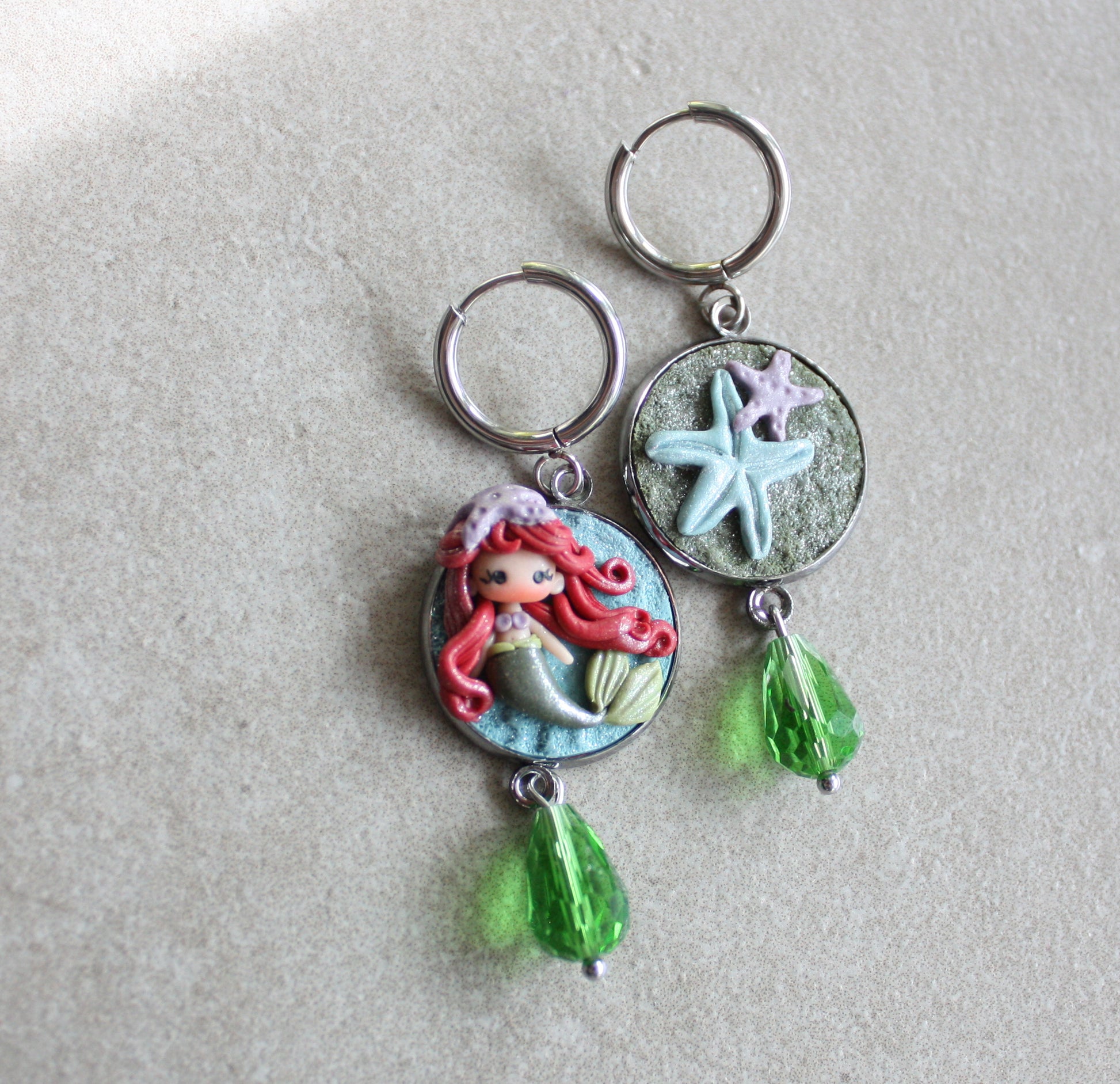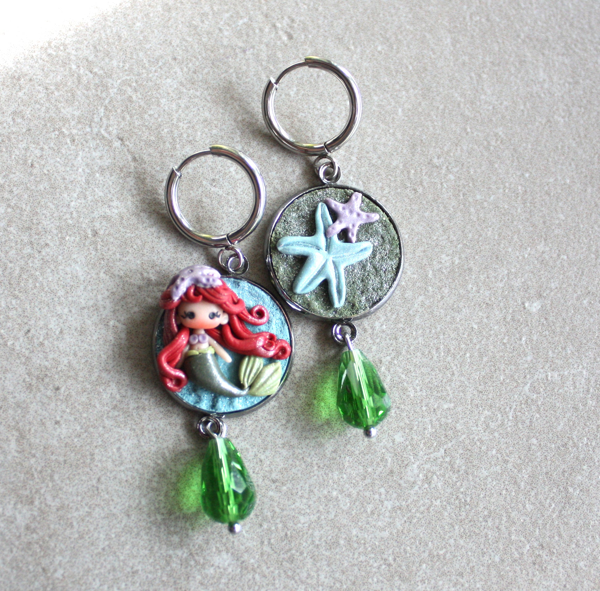 Orecchini in acciaio inox con piccoli cammei decorati a mano e Ariel modellata in pasta polimerica (fimo).