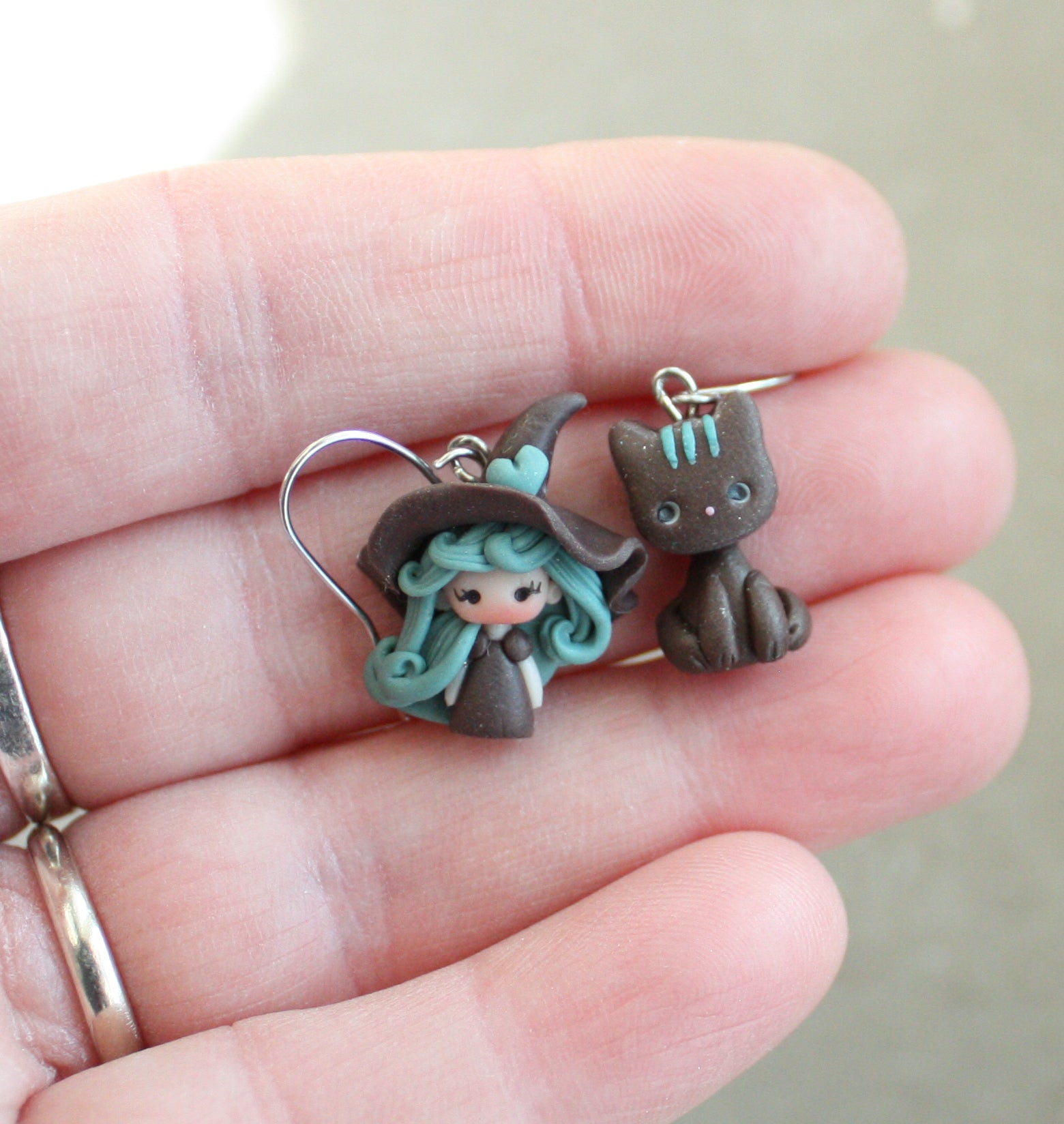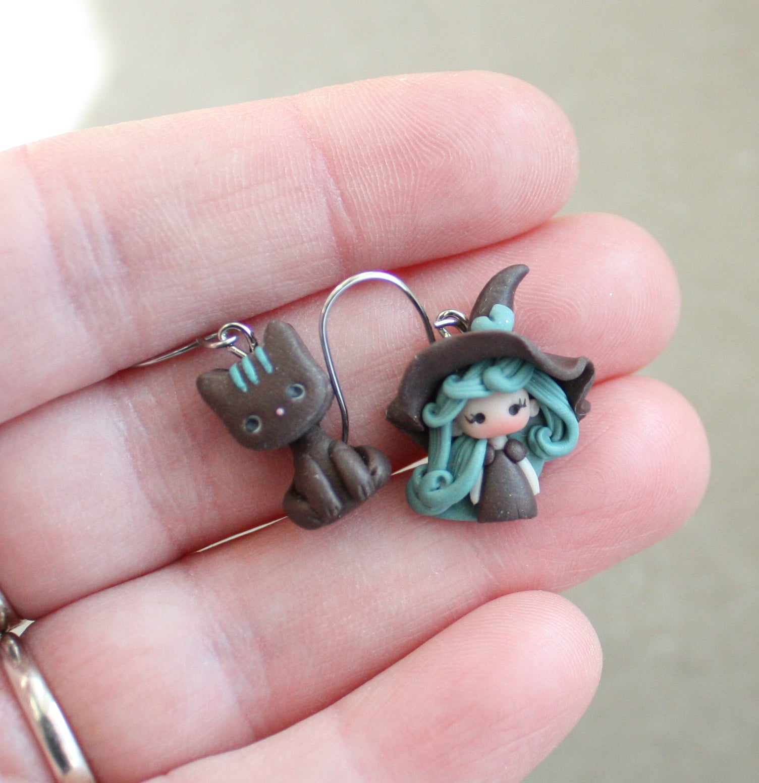 Orecchini pendenti con streghetta e gattino modellati a mano in pasta polimerica (fimo).
