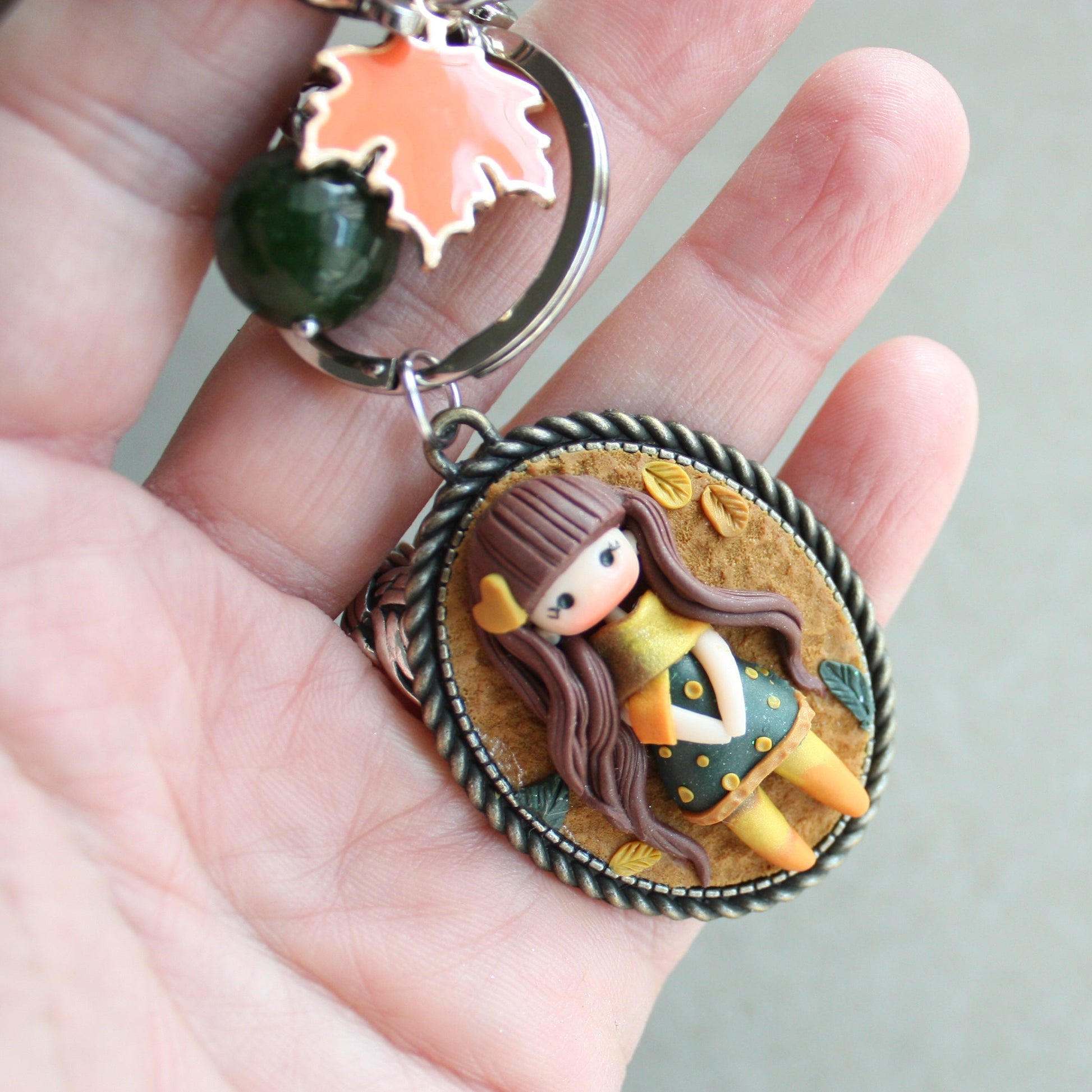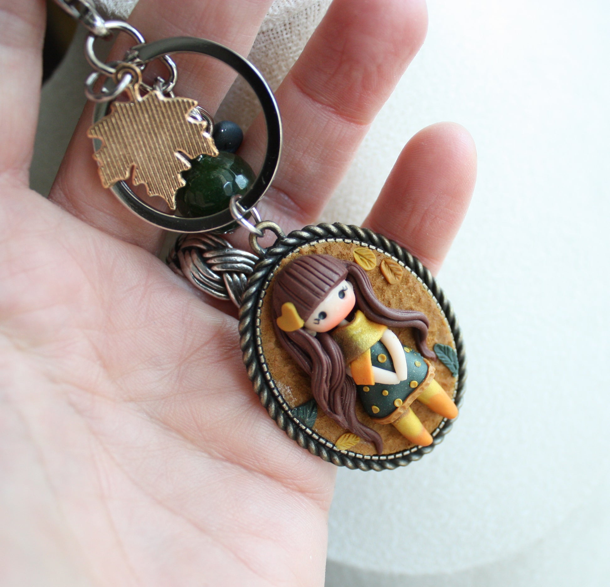 Portachiavi artigianale con piccola doll modellata a mano in pasta polimerica (fimo) e ciondolo a forma di foglia smaltata.