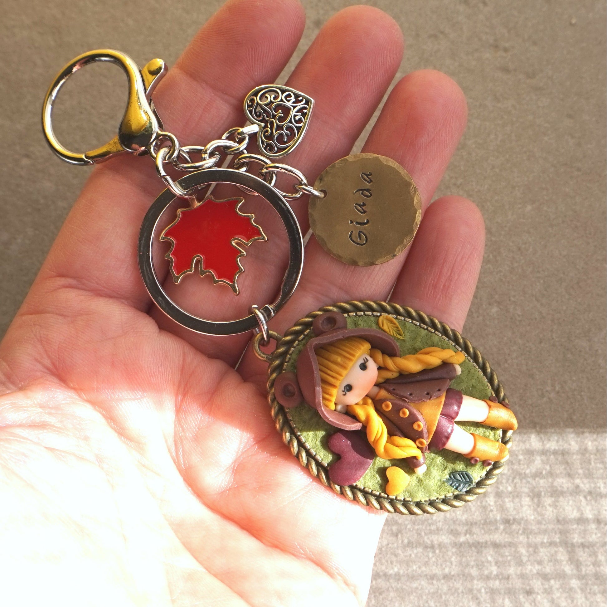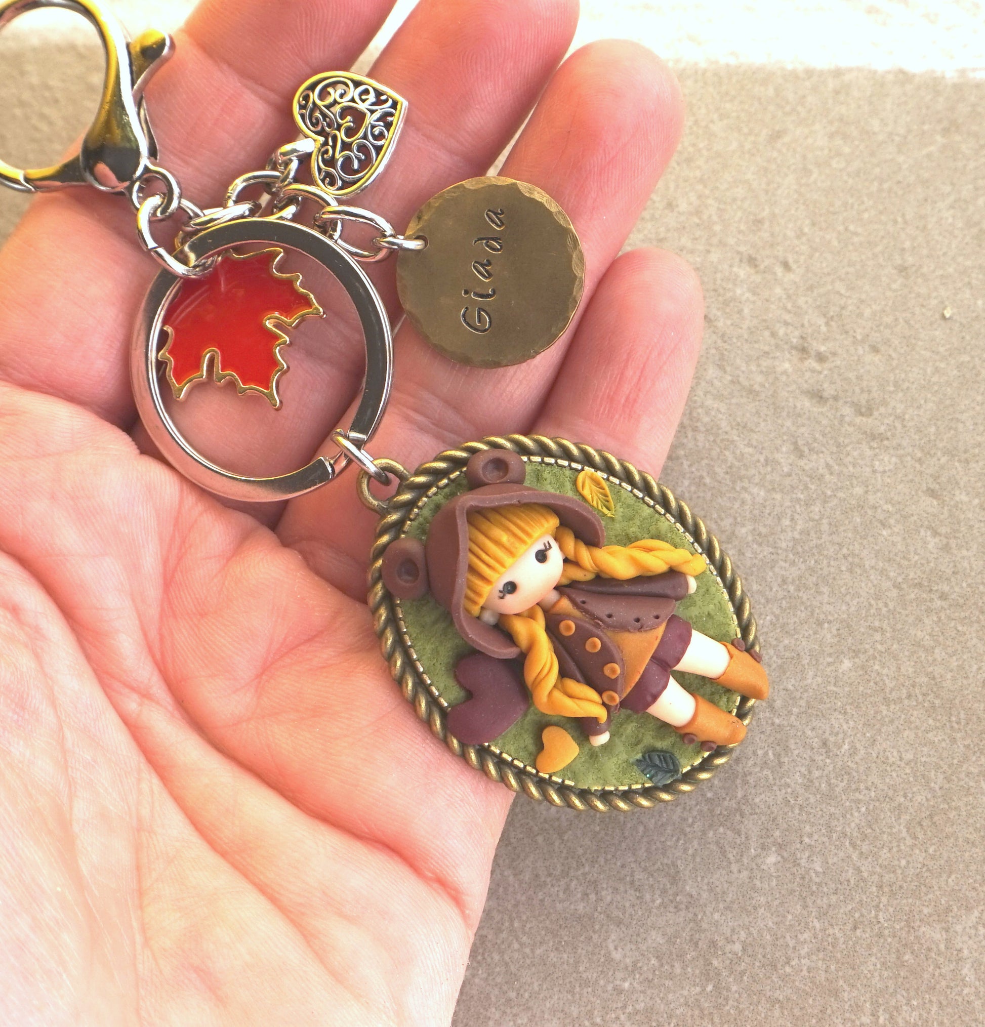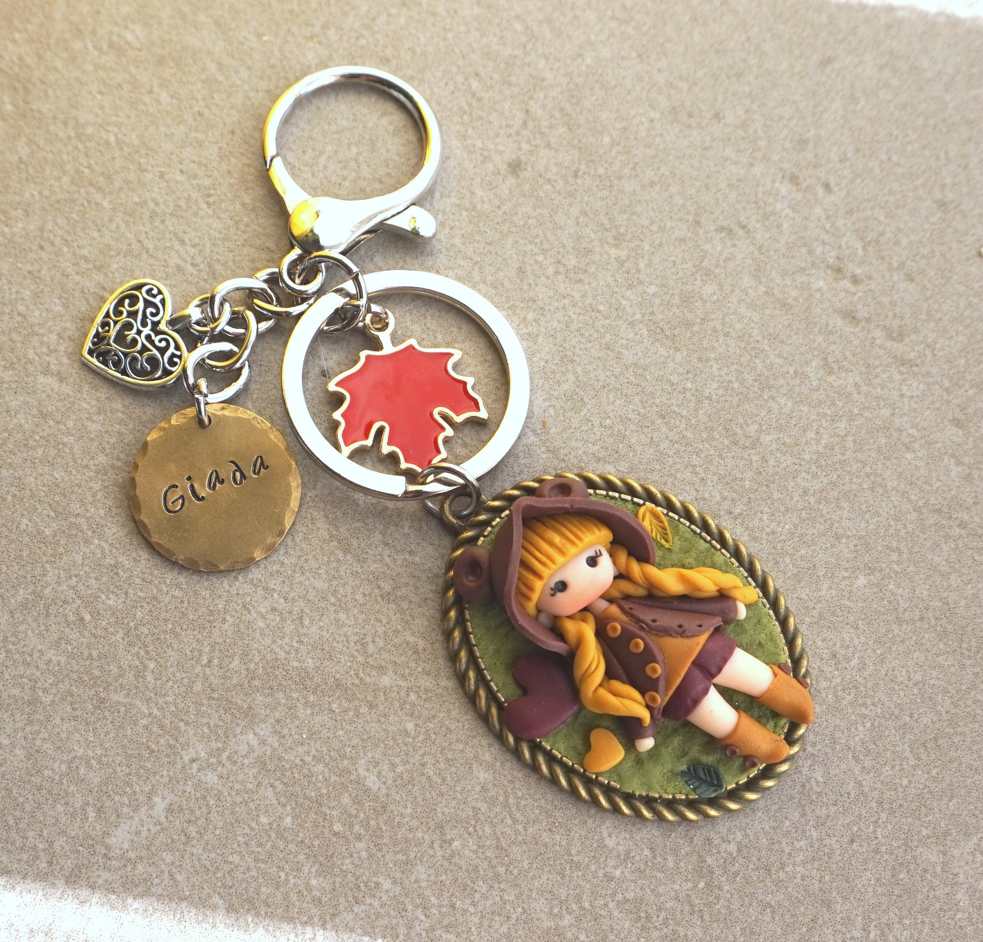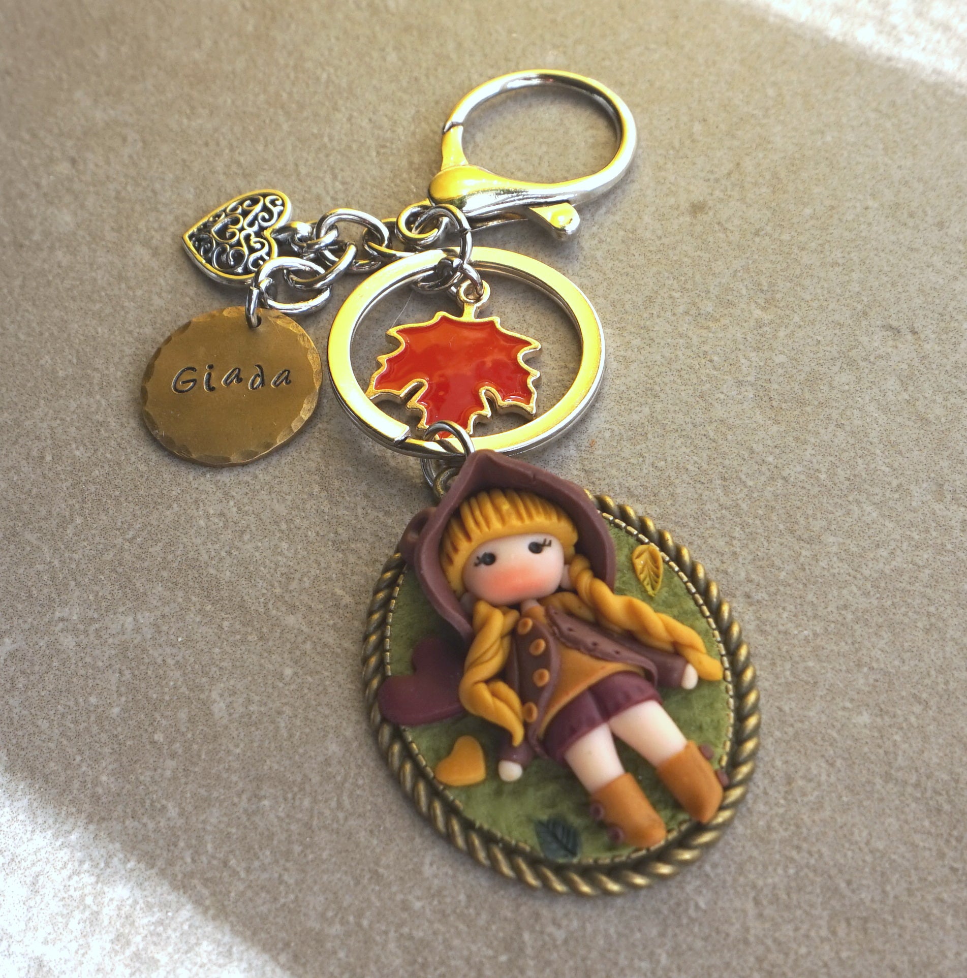 Portachiavi artigianale con piccola Doll modellata a mano in pasta polimerica (fimo) e ciondolo in ottone inciso con il nome che preferisci.