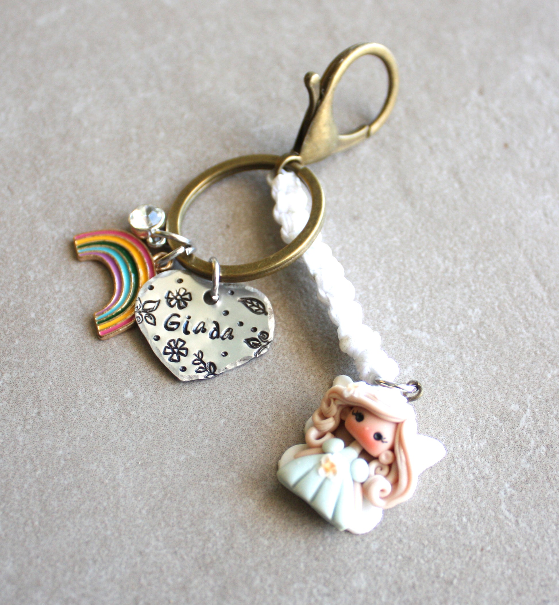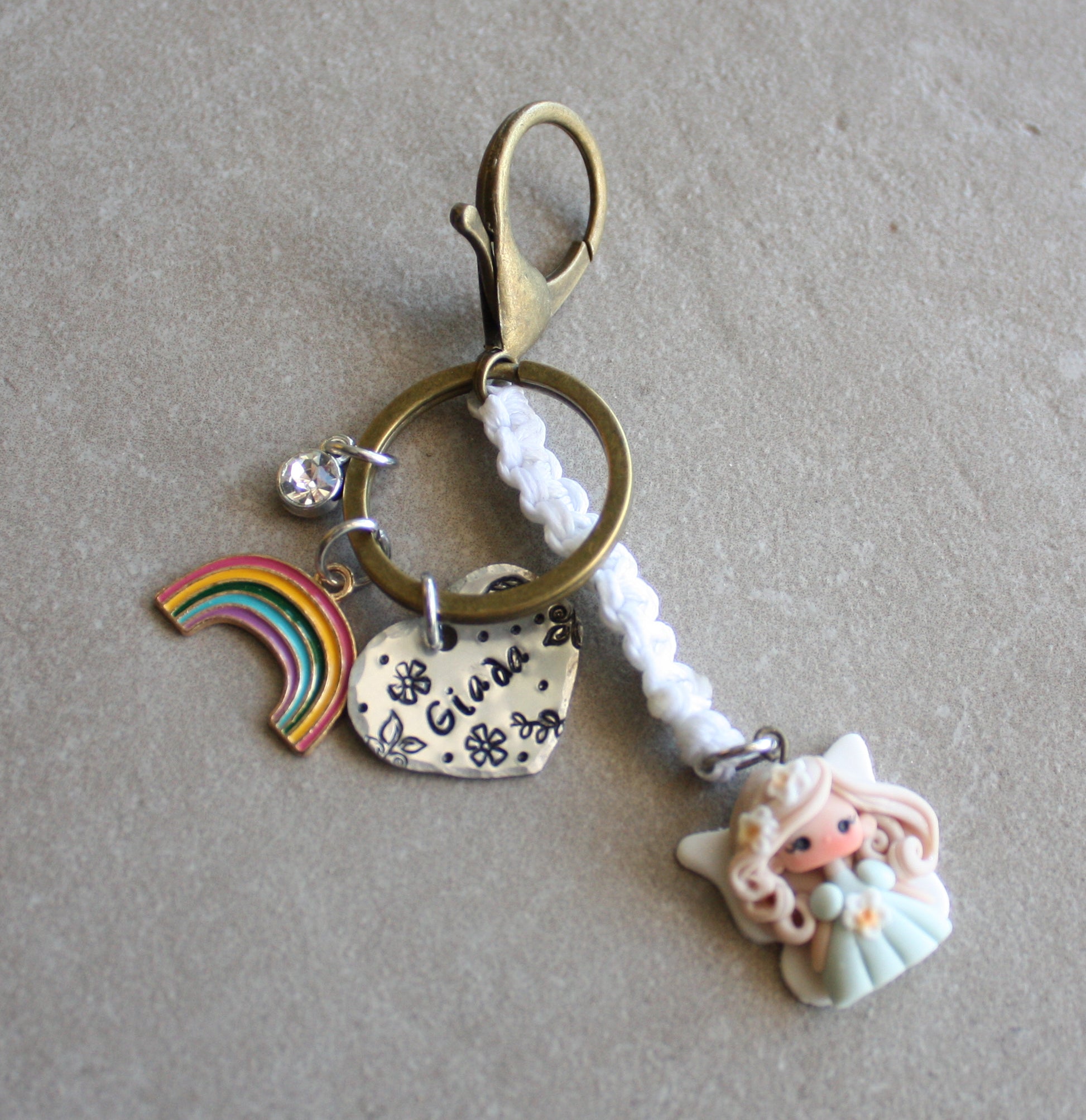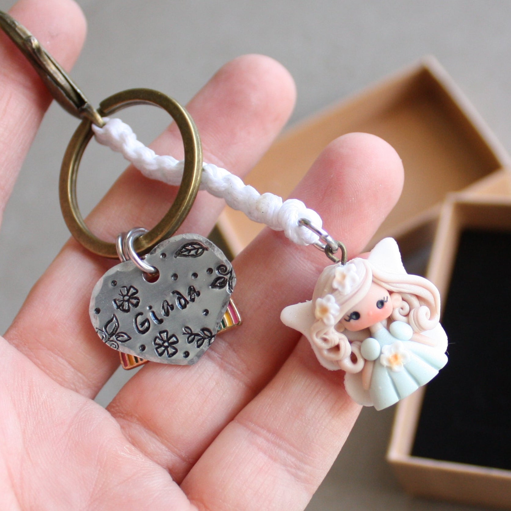 Portachiavi con fatina e cuore inciso – Macramè artigianale
