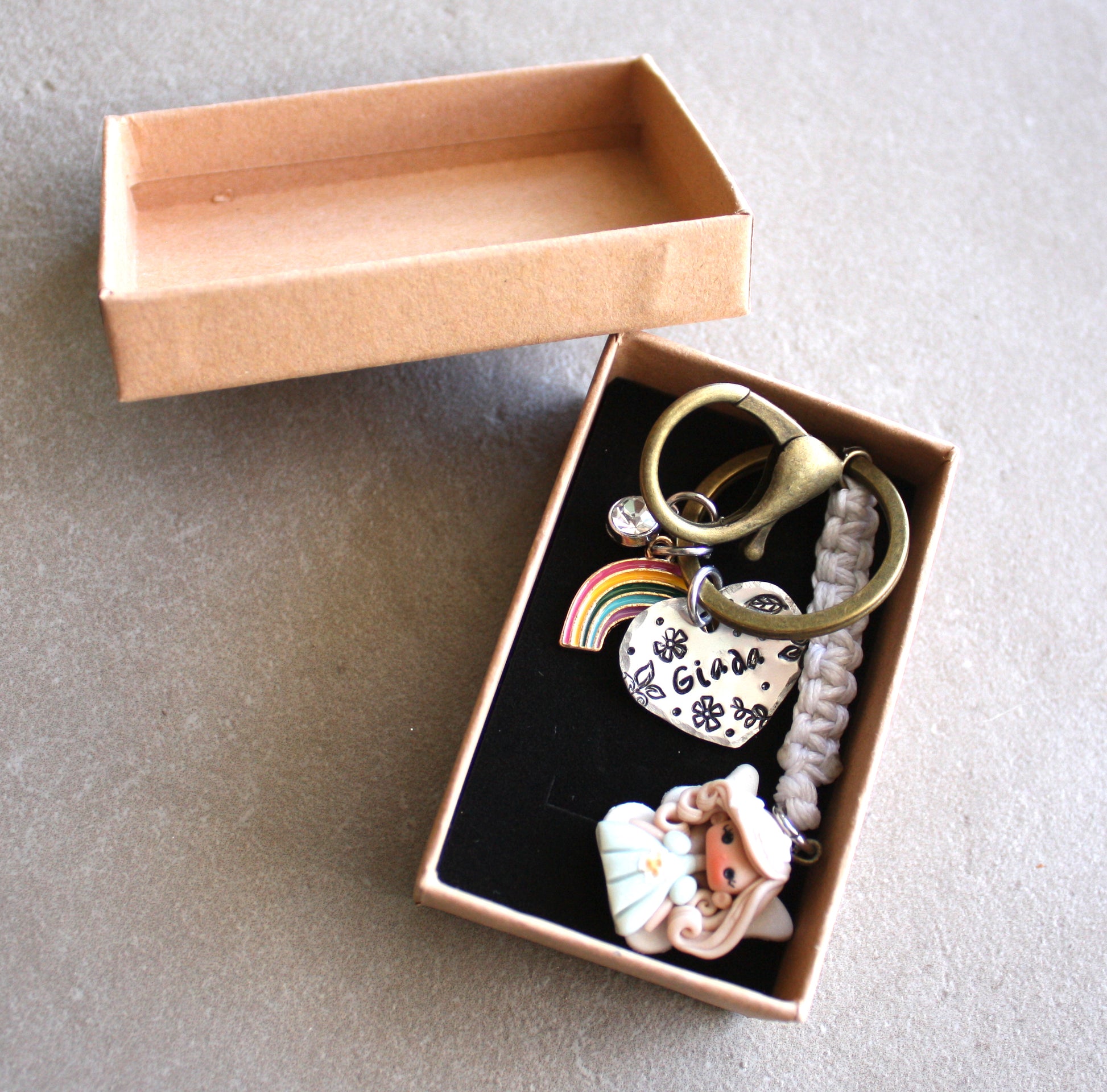 Una piccola fatina in pasta polimerica, modellata senza stampi, accompagna la targhetta a forma di cuore, decorata e incisa a mano con punzoni per metallo. Un regalo personalizzato che racchiude magia e cura nei dettagli, consegnato in una scatolina pronta da donare.