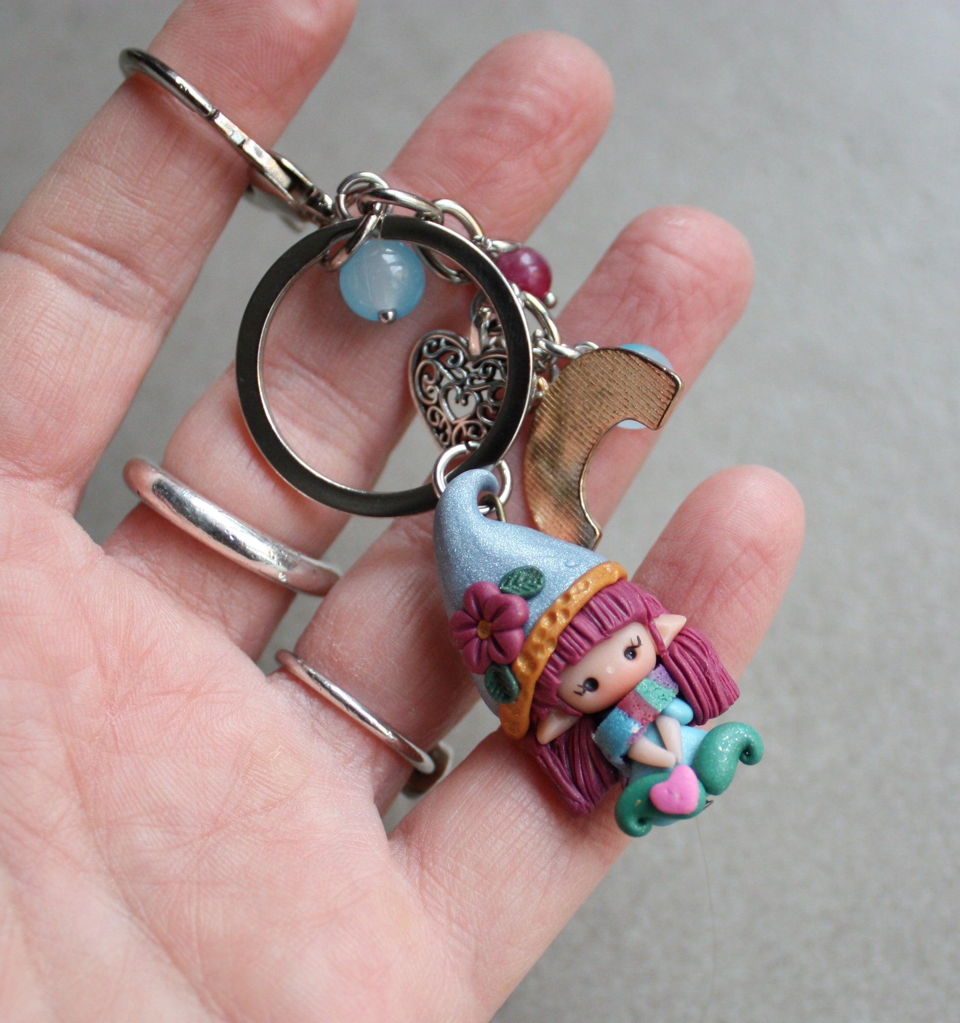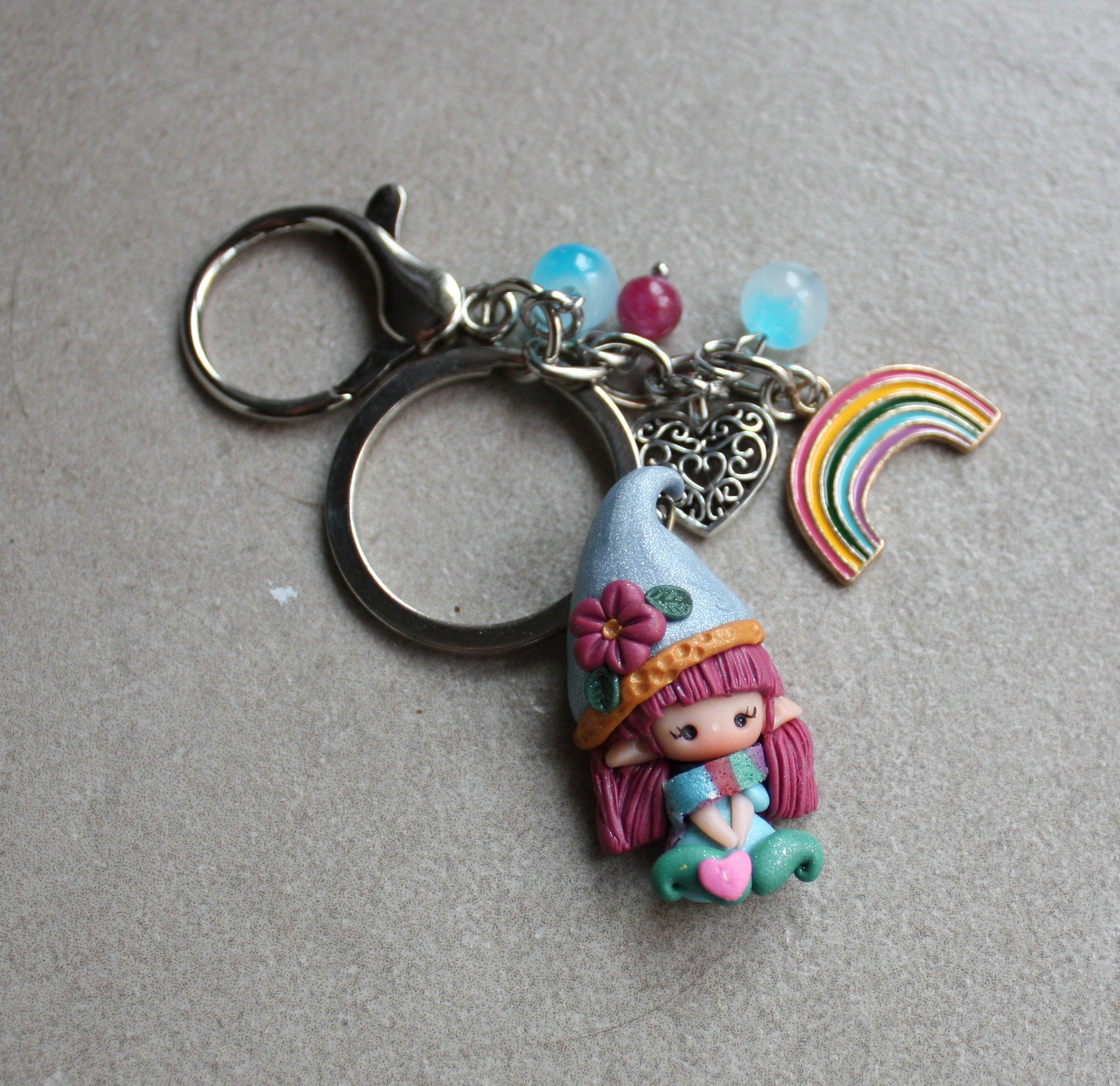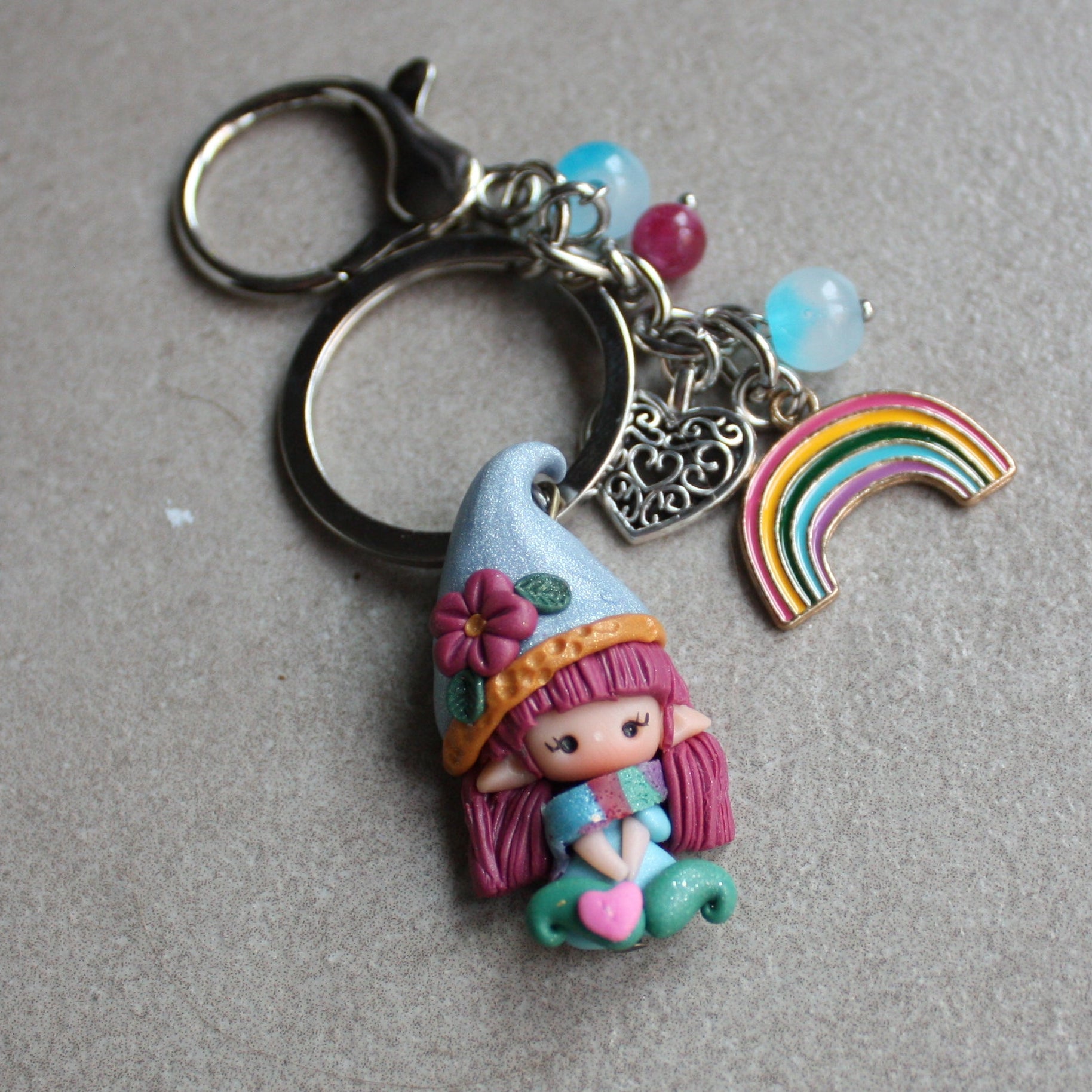 Portachiavi artigianale con piccola gnoma modellata a mano in pasta polimerica (fimo) e charms decorativi coordinati.