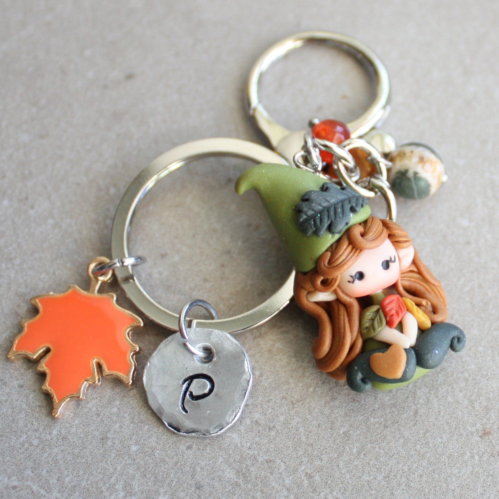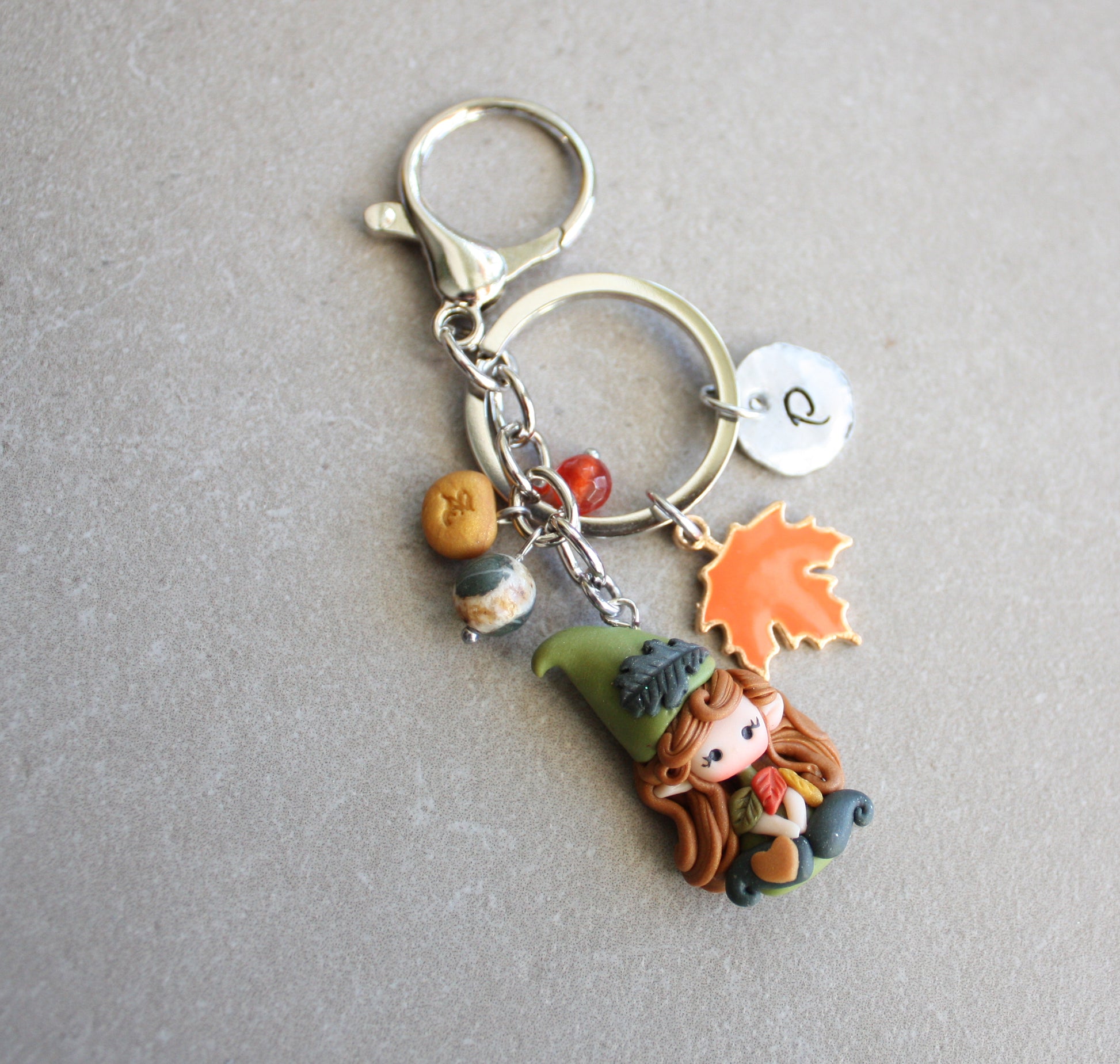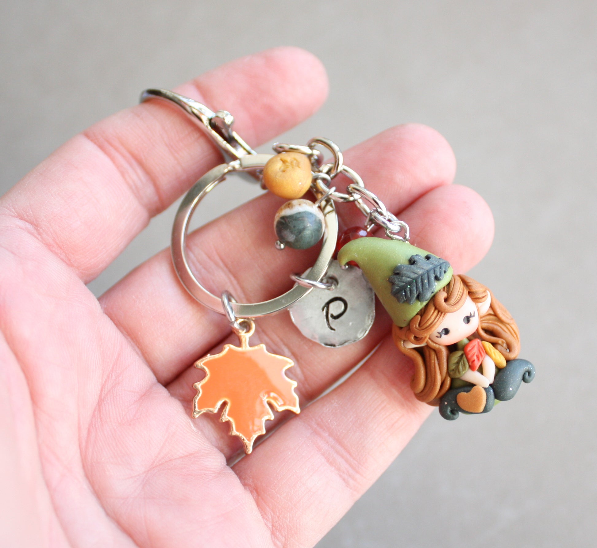 Portachiavi con piccola gnoma modellata a mano in pasta polimerica e disco in alluminio inciso e intagliato a mano, personalizzabile con l’iniziale che preferisci.