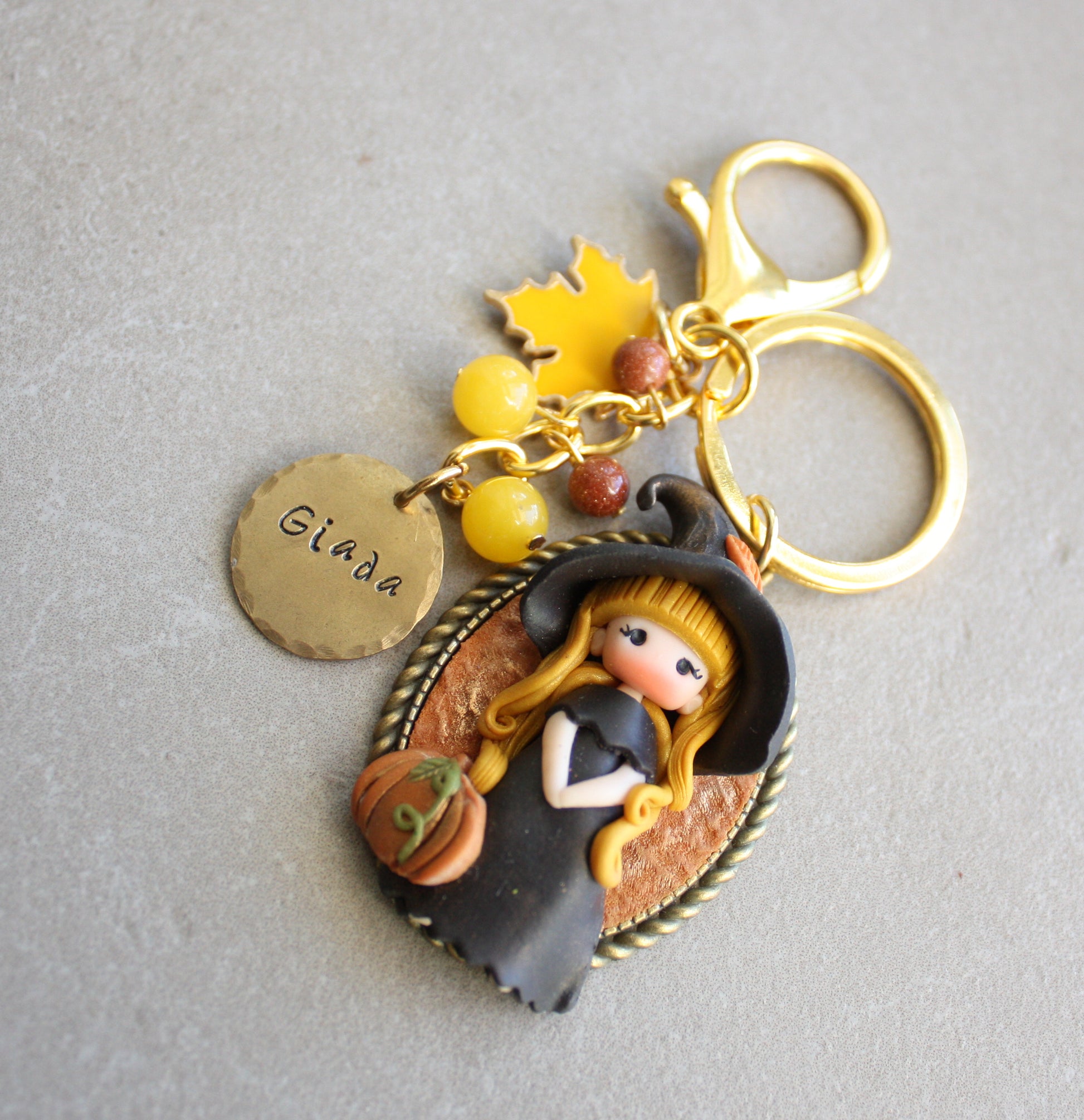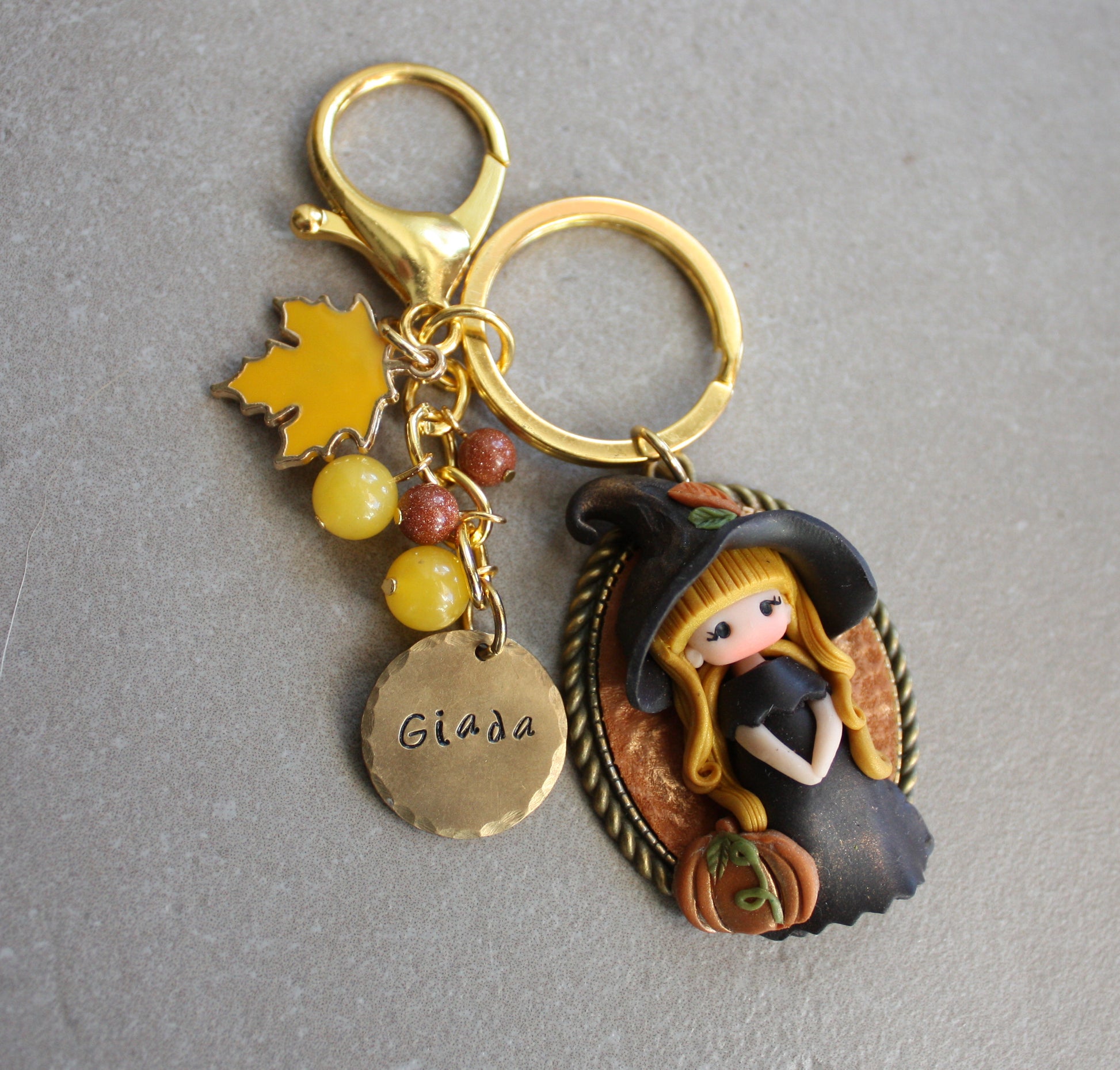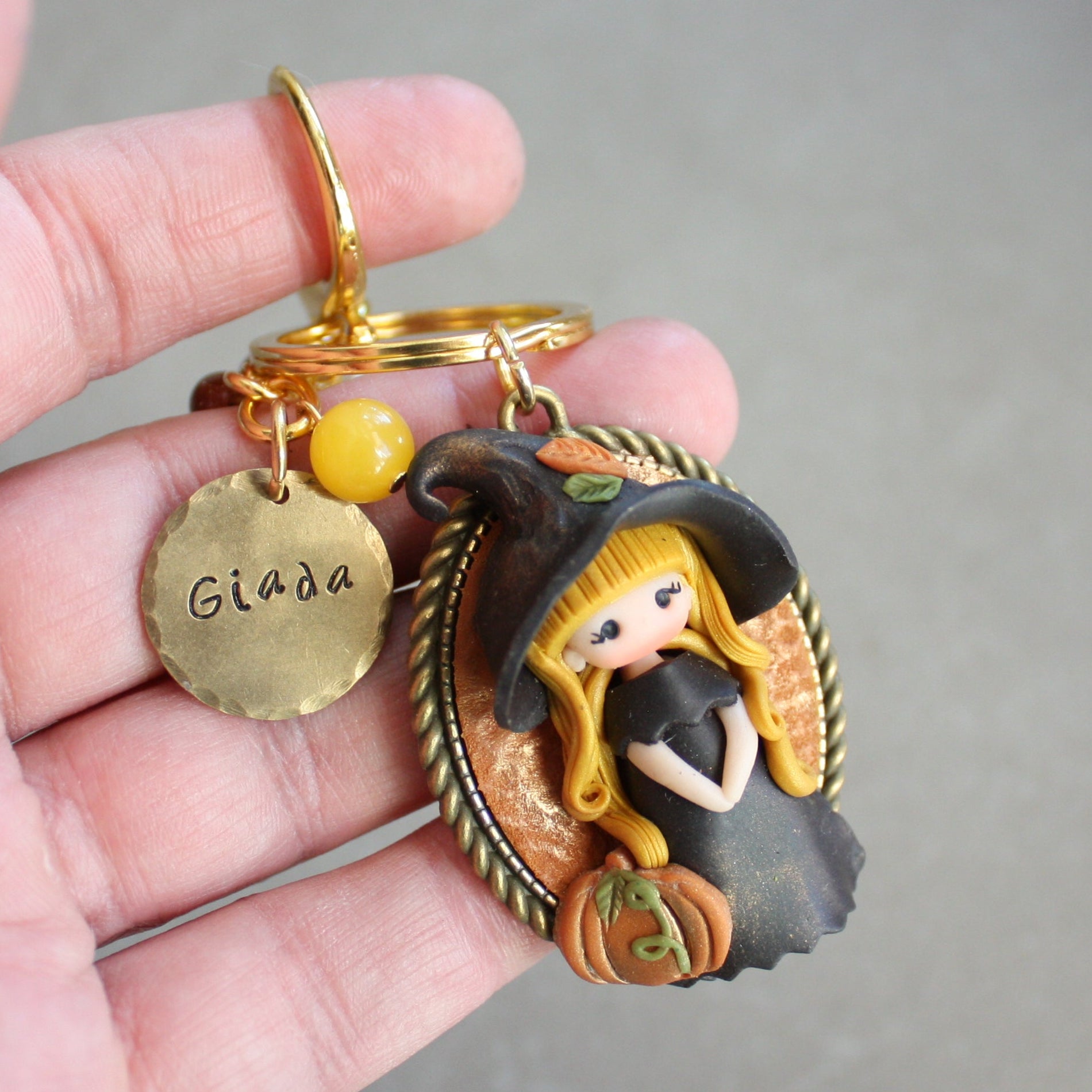 Portachiavi con cammeo bronzato che racchiude una piccola streghetta modellata a mano in pasta polimerica, abbinato a un ciondolo in ottone inciso a mano con il nome che preferisci.