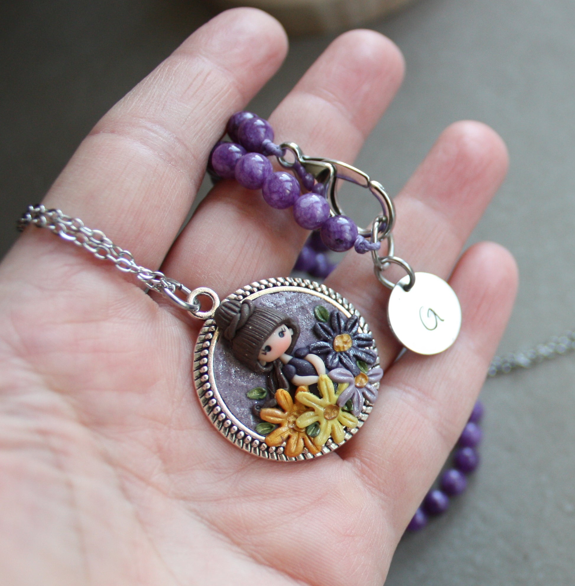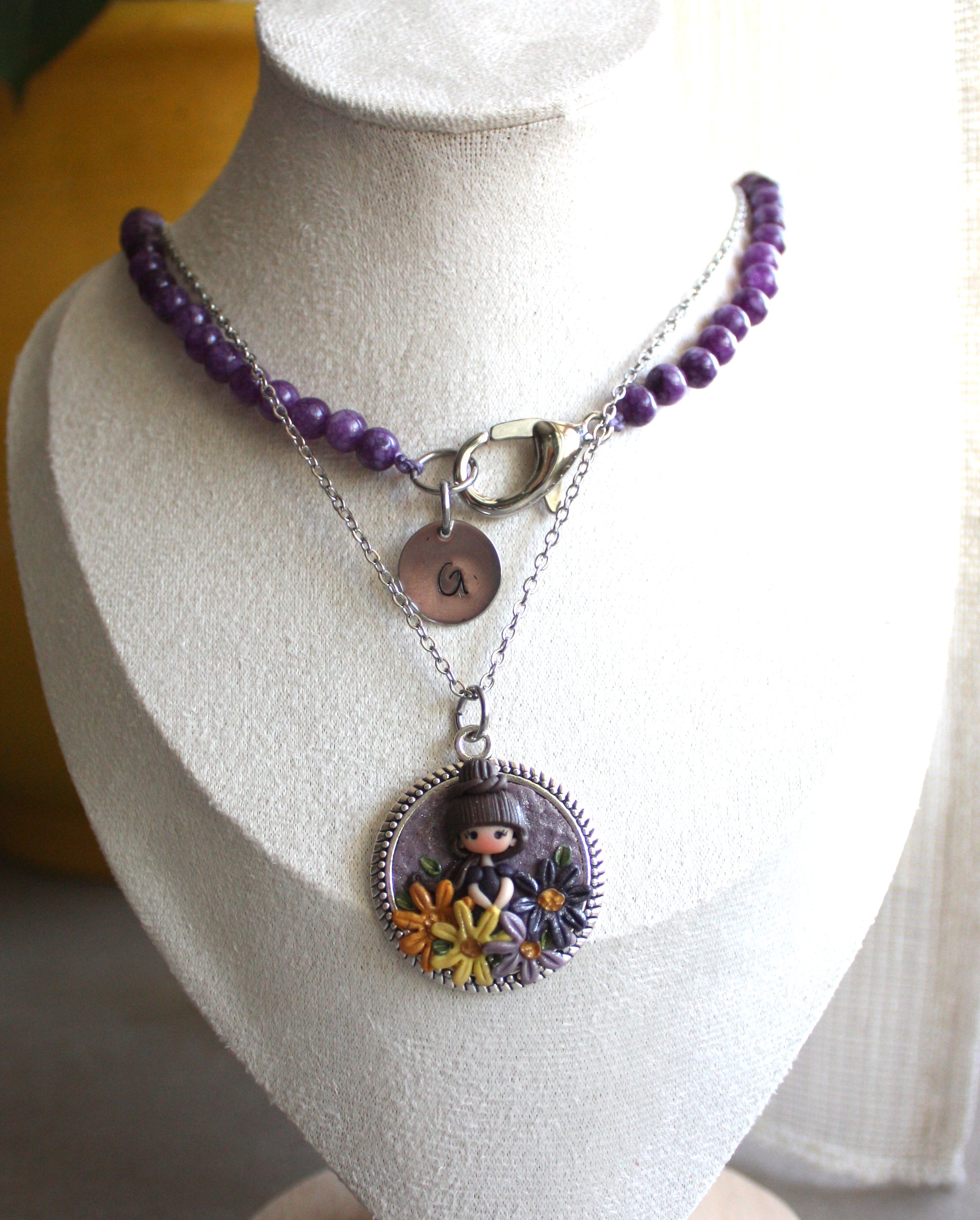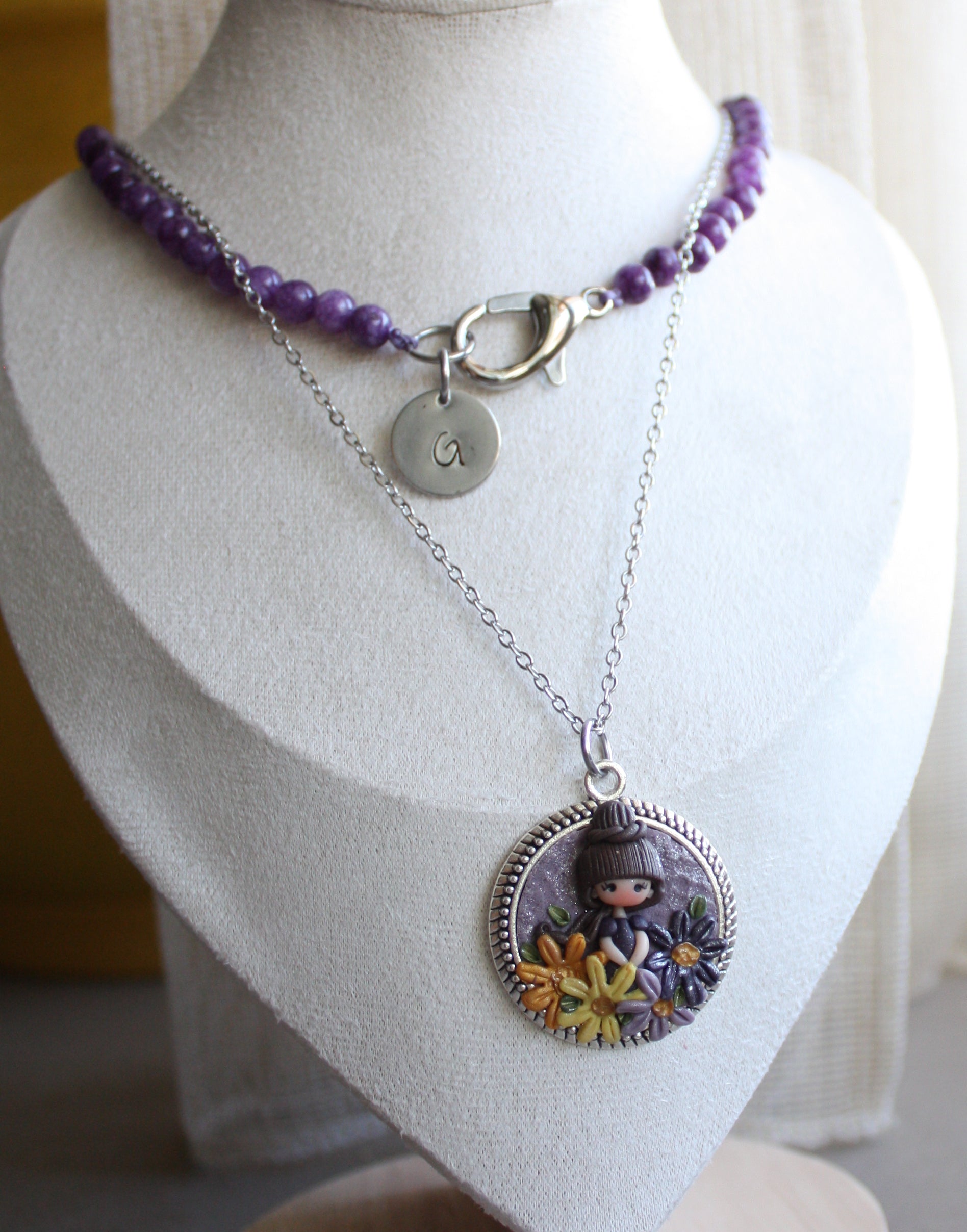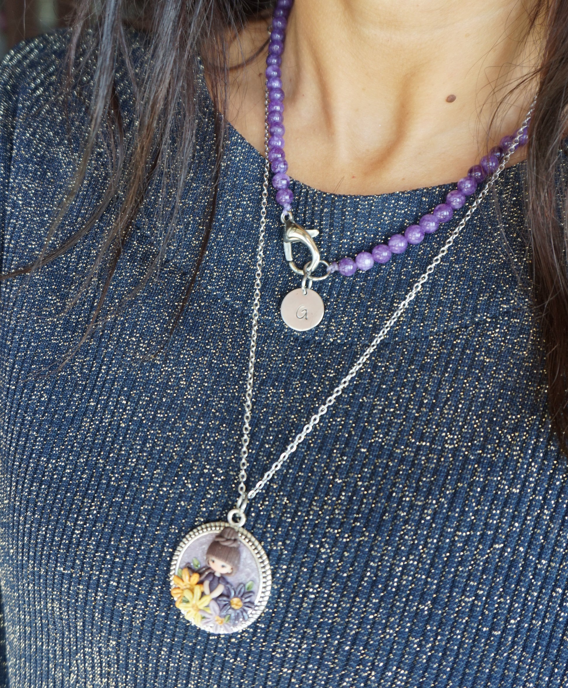 La prima collana è realizzata con pietre dure viola, misura circa 45 cm / 17 inches, e presenta chiusura e lettera iniziale in acciaio inox.